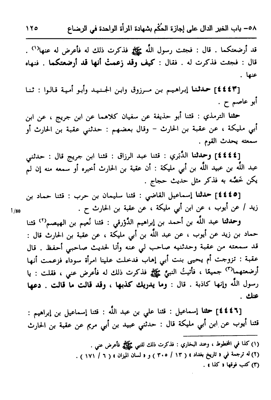 4446 - حثنا إِسْمَاعِيلُ، قَثَنَا عَلِيُّ بْنُ عَبْدِ اللَّهِ، قَثَنَا إِسْمَاعِيلُ بْنُ إِبْرَاهِيمَ، قَثَنَا أَيُّوبُ، عَنِ ابْنِ أَبِي مُلَيْكَةَ، قَالَ: حَدَّثَنِي عُبَيْدُ بْنُ أَبِي مَرْيَمَ، عَنْ عُقْبَةَ بْنِ الْحَارِثِ -[126]-، قَالَ: وَقَدْ سَمِعْتُهُ مِنْ عُقْبَةَ وَلَكِنِّي لِحَدِيثِ عُبَيْدٍ أَحْفَظُ قَالَ: تَزَوَّجْتُ امْرَأَةً فَذَكَرَ الْحَدِيثَ قَالَ عَلِيٌّ: وَثنا عَبْدُ الرَّزَّاقِ عَنْ مَعْمَرٍ، عَنْ أَيُّوبَ بِمِثْلِ حَدِيثِ ابْنِ عُلَيَّةَ فِي هَذَا الْحَدِيثِ نَظَرٌ