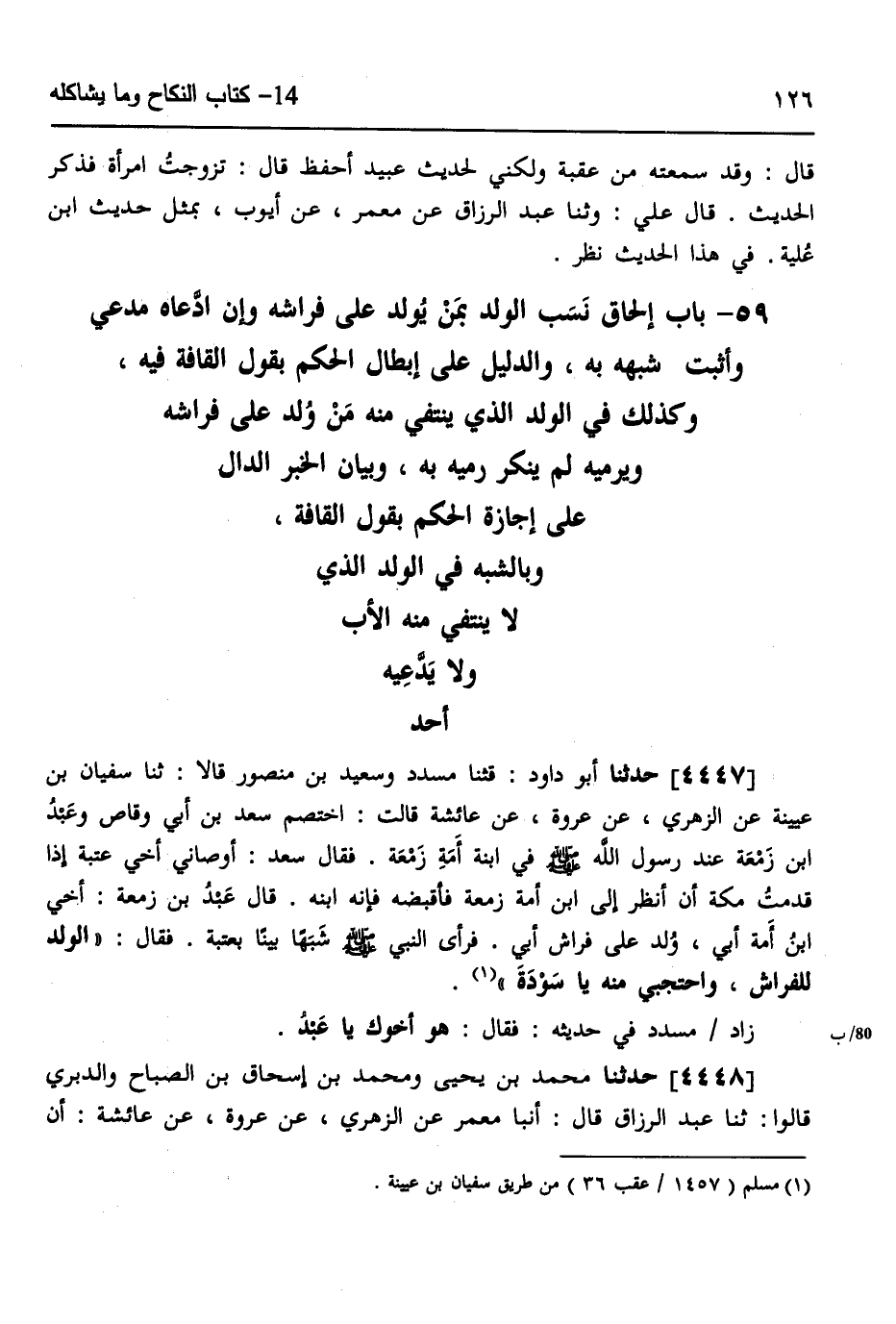 4448 - حَدَّثَنَا مُحَمَّدُ بْنُ يَحْيَى، وَمُحَمَّدُ بْنُ إِسْحَاقَ بْنِ الصَّبَّاحِ، وَالدَّبَرِيُّ، قَالُوا: ثَنَا عَبْدُ الرَّزَّاقِ، قَالَ: أنبا مَعْمَرٌ، عَنِ الزُّهْرِيِّ، عَنْ عُرْوَةَ، عَنْ عَائِشَةَ، أَنَّ -[127]- عُتْبَةَ بْنَ أَبِي وَقَّاصٍ، قَالَ لِأَخِيهِ سَعْدٍ: أَتَعْلَمُ أَنَّ ابْنَ جَارِيَةِ زَمْعَةَ ابْنِي؟، قَالَتْ عَائِشَةُ: فَلَمَّا كَانَ يَوْمُ الْفَتْحِ رَأَى سَعْدٌ الْغُلَامَ، فَعَرَفَهُ بِالشَّبَهِ، فَاحْتَضَنَهُ إِلَيْهِ، وَقَالَ: ابْنُ أَخِي وَرَبِّ الْكَعْبَةِ، فَجَاءَ عَبْدُ بْنُ زَمْعَةَ، فَقَالَ: بَلْ هُوَ أَخِي وُلِدَ عَلَى فِرَاشِ أَبِي مِنْ جَارِيَتِهِ، فَانْطَلَقَا إِلَى النَّبِيِّ صَلَّى اللهُ عَلَيْهِ وَسَلَّمَ، فَقَالَ سَعْدٌ: يَا رَسُولَ اللَّهِ، هُوَ ابْنُ أَخِي انْظُرْ إِلَى شَبَهِهِ بِعُتْبَةَ، قَالَتْ: فَرَأَى رَسُولُ اللَّهِ صَلَّى اللهُ عَلَيْهِ وَسَلَّمَ شَبَهًا لَمْ يَرَ النَّاسُ شَبَهًا أَبْيَنَ مِنْهُ بِعُتْبَةَ، فَقَالَ عَبْدُ بْنُ زَمْعَةَ: يَا رَسُولَ اللَّهِ، بَلْ هُوَ أَخِي وُلِدَ عَلَى فِرَاشِ أَبِي مِنْ جَارِيَتِهِ، فَقَالَ رَسُولُ اللَّهِ صَلَّى اللهُ عَلَيْهِ وَسَلَّمَ: «§الْوَلَدُ لِلْفِرَاشِ وَاحْتَجِبِي مِنْهُ يَا سَوْدَةُ» ، قَالَتْ عَائِشَةُ: فَوَاللَّهِ مَا رَآهَا حَتَّى مَاتَتْ