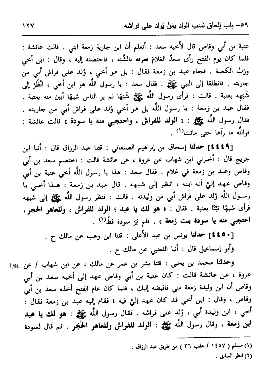 4449 - حَدَّثَنَا إِسْحَاقُ بْنُ إِبْرَاهِيمَ الصَّنْعَانِيُّ، قَثَنَا عَبْدُ الرَّزَّاقِ، قَالَ: أنبا ابْنُ جُرَيْجٍ، قَالَ: أَخْبَرَنِي ابْنُ شِهَابٍ، عَنْ عُرْوَةَ، عَنْ عَائِشَةَ، قَالَتِ: اخْتَصَمَ سَعْدُ بْنُ أَبِي وَقَّاصٍ وَعَبْدُ بْنُ زَمْعَةَ فِي غُلَامٍ، فَقَالَ سَعْدٌ: هَذَا يَا رَسُولَ اللَّهِ، أَخِي عُتْبَةُ بْنُ أَبِي وَقَّاصٍ عَهِدَ إِلَيَّ أَنَّهُ ابْنُهُ انْظُرْ إِلَى شَبَهِهِ قَالَ عَبْدُ بْنُ زَمْعَةَ: هَذَا أَخِي يَا رَسُولَ اللَّهِ، وُلِدَ عَلَى فِرَاشِ أَبِي مِنْ وَلِيدَتِهِ، قَالَتْ: فَنَظَرَ رَسُولُ اللَّهِ صَلَّى اللهُ عَلَيْهِ وَسَلَّمَ إِلَى شَبَهِهِ، فَرَأَى شَبَهًا بِيِّنًا بِعُتْبَةَ، فَقَالَ: «§هُوَ لَكَ يَا عَبْدُ، الْوَلَدُ لِلْفِرَاشِ وَلِلْعَاهِرِ الْحَجَرُ احْتَجِبِي مِنْهُ يَا سَوْدَةُ بِنْتَ زَمْعَةَ» ، فَلَمْ يَرَ سَوْدَةَ قَطُّ