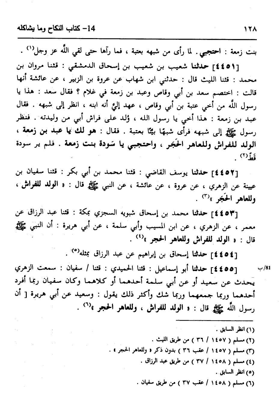 4451 - حَدَّثَنَا شُعَيْبُ بْنُ شُعَيْبِ بْنِ إِسْحَاقَ الدِّمَشْقِيُّ، قَثَنَا مَرْوَانُ بْنُ مُحَمَّدٍ، قَثَنَا اللَّيْثُ، قَالَ حَدَّثَنِي ابْنُ شِهَابٍ، عَنْ عُرْوَةَ بْنِ الزُّبَيْرِ، عَنْ عَائِشَةَ، أَنَّهَا قَالَتِ اخْتَصَمَ سَعْدُ بْنُ أَبِي وَقَّاصٍ، وَعَبْدُ بْنُ زَمْعَةَ فِي غُلَامٍ، فَقَالَ سَعْدٌ: هَذَا يَا رَسُولَ اللَّهِ، مِنْ أَخِي عُتْبَةَ بْنِ أَبِي وَقَّاصٍ عَهِدَ إِلَيَّ أَنَّهُ ابْنُهُ انْظُرْ إِلَى شَبَهِهِ، فَقَالَ عَبْدُ بْنُ زَمْعَةَ: هَذَا أَخِي يَا رَسُولَ اللَّهِ، وُلِدَ عَلَى فِرَاشِ أَبِي مِنْ وَلِيدَتِهِ، فَنَظَرَ رَسُولُ صَلَّى اللهُ عَلَيْهِ وَسَلَّمَ إِلَى شَبَهِهِ، فَرَأَى شَبَهًا بَيِّنًا بِعُتْبَةَ فَقَالَ: «§هُوَ لَكُ يَا عَبْدُ بْنَ زَمْعَةَ الْوَلَدُ لِلْفِرَاشِ وَلِلْعَاهِرِ الْحَجَرُ، وَاحْتَجِبِي يَا سَوْدَةُ بِنْتَ زَمْعَةَ» فَلَمْ يَرَ سَوْدَةَ قَطُّ