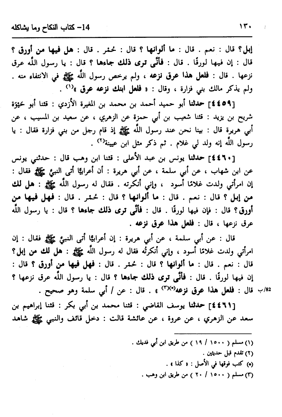 4460 - حَدَّثَنَا يُونُسُ بْنُ عَبْدِ الْأَعْلَى، قَثَنَا ابْنُ وَهْبٍ، قَالَ: حَدَّثَنِي يُونُسُ، عَنِ ابْنِ شِهَابٍ، عَنْ أَبِي سَلَمَةَ، عَنْ أَبِي هُرَيْرَةَ، أَنَّ أَعْرَابِيًّا أَتَى النَّبِيَّ صَلَّى اللهُ عَلَيْهِ وَسَلَّمَ، فَقَالَ: إِنَّ امْرَأَتِي وَلَدَتْ غُلَامًا أَسْوَدَ، وَإِنِّي أَنْكَرْتُهُ، فَقَالَ لَهُ رَسُولُ اللَّهِ صَلَّى اللهُ عَلَيْهِ وَسَلَّمَ: «§هَلْ لَكَ مِنْ إِبِلٍ؟» ، قَالَ: نَعَمْ قَالَ: «مَا أَلْوَانُهَا؟» ، قَالَ: حُمْرٌ، قَالَ: «فَهَلْ فِيهَا مِنْ أَوْرَقَ؟» ، قَالَ: فَإِنَّ فِيهَا لَوُرْقًا، قَالَ: «فَأَنَّى تَرَى ذَلِكَ جَاءَهَا؟» ، قَالَ: يَا رَسُولَ اللَّهِ، عِرْقٌ نَزَعَهَا قَالَ: «فَلَعَلَّ هَذَا عِرْقٌ نَزَعَهُ» ، قَالَ: عَنْ أَبِي سَلَمَةَ عَنْ أَبِي هُرَيْرَةَ أَنَّ أَعْرَابِيًّا أَتَى النَّبِيَّ صَلَّى اللهُ عَلَيْهِ وَسَلَّمَ فَقَالَ: إِنَّ امْرَأَتِي وَلَدَتْ غُلَامًا أَسْوَدَ وَإِنِّي أَنْكَرْتُهُ فَقَالَ لَهُ رَسُولُ اللَّهِ صَلَّى اللهُ عَلَيْهِ وَسَلَّمَ: «هَلْ لَكَ مِنْ إِبِلٍ؟» قَالَ: نَعَمْ قَالَ: «مَا أَلْوَانُهَا؟» قَالَ: حُمْرٌ قَالَ: «فَهَلْ فِيهَا مِنْ أَوْرَقَ؟» قَالَ: إِنَّ فِيهَا لَوُرْقًا قَالَ: «فَأَنَّى تَرَى ذَلِكَ جَاءَهَا؟» قَالَ: يَا رَسُولَ اللَّهِ، عِرْقٌ نَزَعَهَا قَالَ: «فَلَعَلَّ هَذَا عِرْقٌ نَزَعَهُ» قَالَ عَنْ أَبِي سَلَمَةَ وَهُوَ صَحِيحٌ.