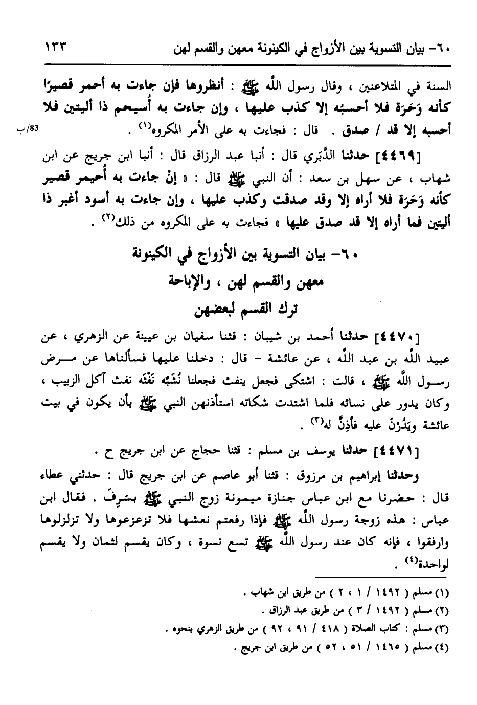 4471 - حَدَّثَنَا يُوسُفُ بْنُ مُسْلِمٍ، قَثَنَا حَجَّاجٌ، عَنِ ابْنِ جُرَيْجٍ، ح وَحَدَّثَنَا إِبْرَاهِيمُ بْنُ مَرْزُوقٍ، قَثَنَا أَبُو عَاصِمٍ، عَنِ ابْنِ جُرَيْجٍ، قَالَ: حَدَّثَنِي عَطَاءٌ، قَالَ: حَضَرْنَا مَعَ ابْنِ عَبَّاسٍ جِنَازَةَ مَيْمُونَةَ زَوْجِ النَّبِيِّ صَلَّى اللهُ عَلَيْهِ وَسَلَّمَ بِسَرِفٍ، فَقَالَ ابْنُ عَبَّاسٍ: هَذِهِ زَوْجَةُ رَسُولِ اللَّهِ صَلَّى اللهُ عَلَيْهِ وَسَلَّمَ، فَإِذَا رَفَعْتُمْ نَعْشَهَا، فَلَا تُزَعْزِعُوهَا، وَلَا تُزَلْزِلُوهَا، وَارْفُقُوا، فَإِنَّهُ §كَانَ عِنْدَ رَسُولِ اللَّهِ صَلَّى اللهُ عَلَيْهِ وَسَلَّمَ تِسْعُ نِسْوَةٍ، وَكَانَ يَقْسِمُ لِثَمَانٍ، وَلَا يَقْسِمُ لِوَاحِدَةٍ " -[134]-،