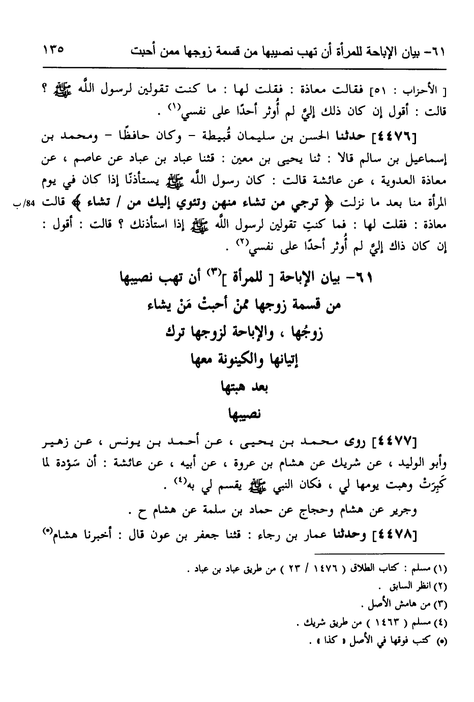 4477 - رَوَى مُحَمَّدُ بْنُ يَحْيَى، عَنْ أَحْمَدَ بْنِ يُونُسَ، عَنْ زُهَيْرٍ، وَأَبُو الْوَلِيدِ، عَنْ شَرِيكٍ، عَنْ هِشَامِ بْنِ عُرْوَةَ، عَنْ أَبِيهِ، عَنْ عَائِشَةَ، أَنَّ " §سَوْدَةَ، لَمَّا كَبِرَتْ وَهَبَتْ يَوْمَهَا لِي، فَكَانَ النَّبِيُّ صَلَّى اللهُ عَلَيْهِ وَسَلَّمَ يَقْسِمُ لِي بِهِ، وَجَرِيرٌ عَنْ هِشَامٍ، وَحَجَّاجٌ عَنْ حَمَّادِ بْنِ سَلَمَةَ، عَنْ هِشَامٍ ح
