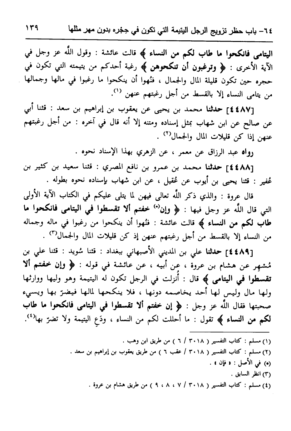 4488 - حَدَّثَنَا مُحَمَّدُ بْنُ عَمْرِو بْنِ نَافِعٍ الْمِصْرِيُّ، قثنا سَعِيدُ بْنُ كَثِيرِ بْنِ عُفَيْرٍ، قثنا يَحْيَى بْنُ أَيُّوبَ، عَنْ عُقَيْلٍ، عَنِ ابْنِ شِهَابٍ، بِإِسْنَادِهِ نَحْوَهُ بِطُولِهِ قَالَ عُرْوَةُ: " §وَالَّذِي ذَكَرَ اللَّهُ تَعَالَى فِيهِنَّ لِمَا يُتْلَى عَلَيْكُمْ فِي الْكِتَابِ الْآيَةَ الْأُولَى الَّتِي قَالَ اللَّهُ عَزَّ وَجَلَّ فِيهَا {وَإِنْ خِفْتُمْ أَلَا تُقْسِطُوا فِي الْيَتَامَى فَانْكِحُوا مَا طَابَ لَكُمْ مِنَ النِّسَاءِ} [النساء: 3] قَالَتْ عَائِشَةُ: فَنُهُوا أَنْ يَنْكِحُوا مَنْ رَغِبُوا فِي مَالِهِ، وَجَمَالِهِ مِنَ النِّسَاءِ إِلَّا بِالْقِسْطِ مِنْ أَجْلِ رَغْبَتِهِمْ عَنْهُنَّ إِذْ كُنَّ قَلِيلَاتِ الْمَالِ وَالْجَمَالِ "