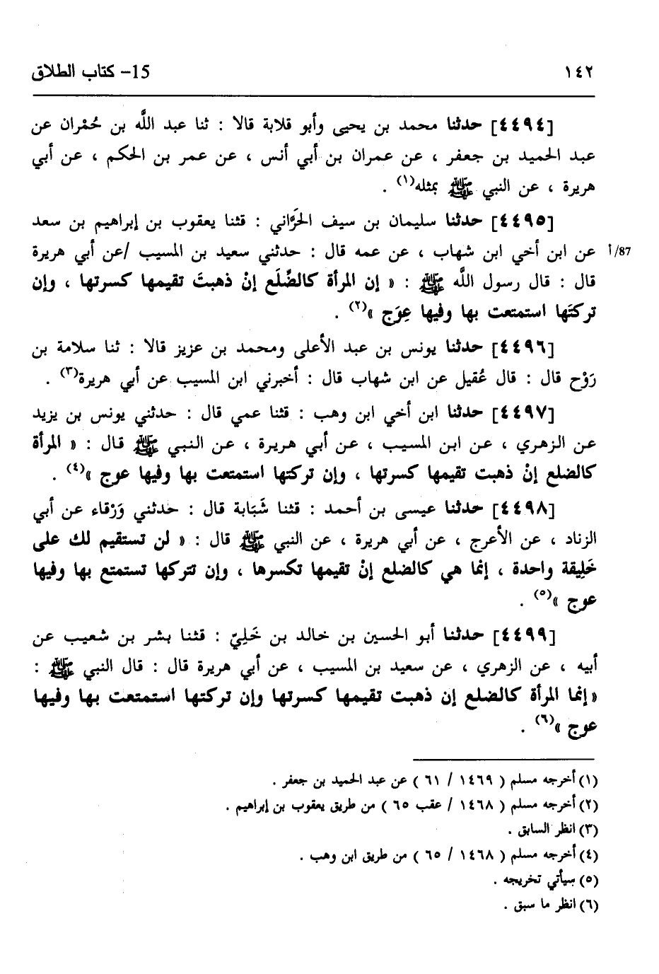 4495 - حَدَّثَنَا سُلَيْمَانُ بْنُ سَيْفٍ الْحَرَّانِيُّ، قثنا يَعْقُوبُ بْنُ إِبْرَاهِيمَ بْنِ سَعْدٍ، عَنِ ابْنِ أَخِي ابْنِ شِهَابٍ، عَنْ عَمِّهِ، قَالَ: حَدَّثَنِي سَعِيدُ بْنُ الْمُسَيِّبِ، عَنْ أَبِي هُرَيْرَةَ، قَالَ: قَالَ رَسُولُ اللَّهِ صَلَّى اللهُ عَلَيْهِ وَسَلَّمَ: «إِنَّ §الْمَرْأَةَ كَالضِّلَعِ إِنْ ذَهَبْتَ تُقِيمُهَا كَسَرْتَهَا، وَإِنْ تَرَكْتَهَا اسْتَمْتَعْتَ بِهَا، وَفِيهَا عِوَجٌ» ،