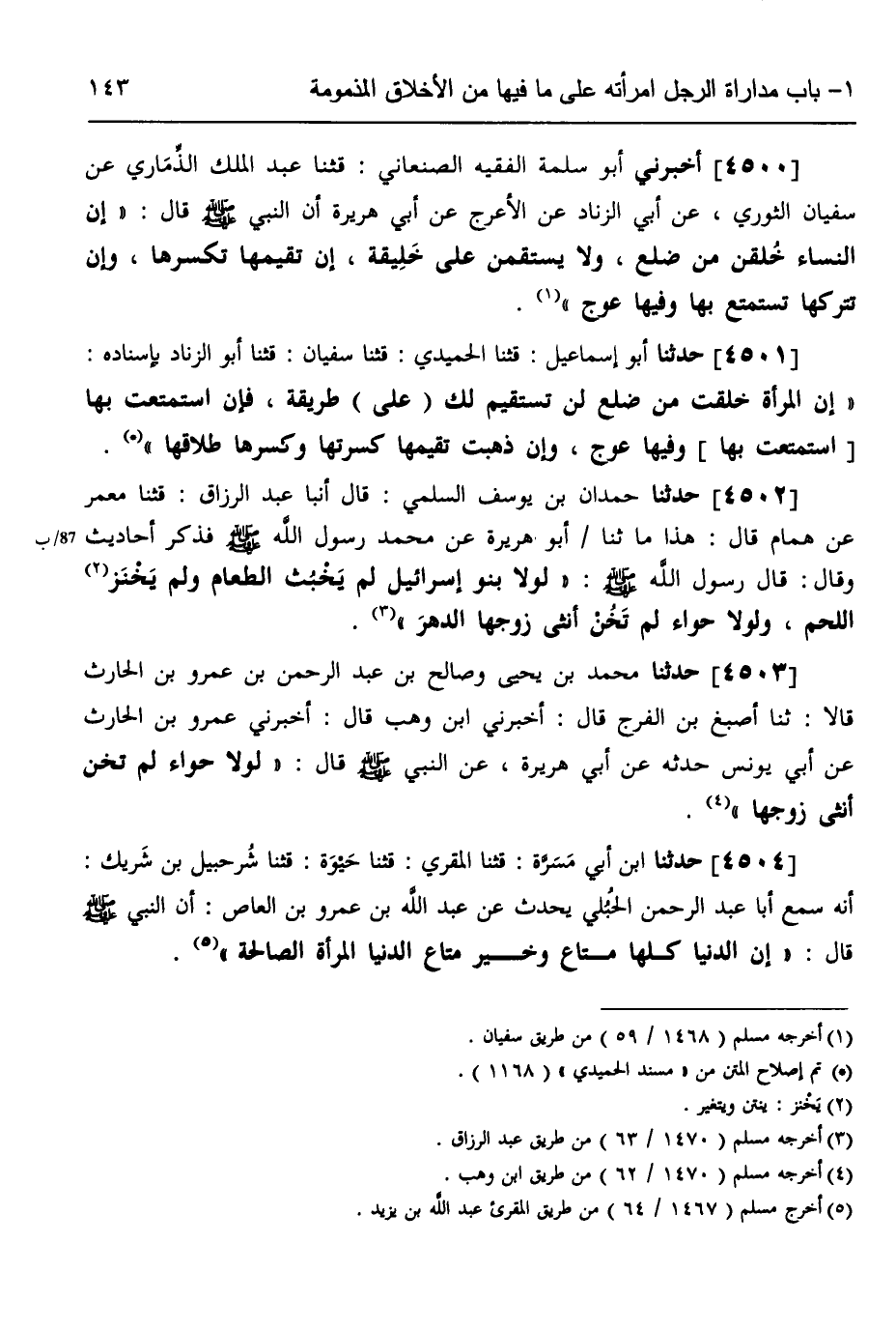 4500 - أَخْبَرَنِي أَبُو سَلَمَةَ الْفَقِيهُ الصَّنْعَانِيُّ، قثنا عَبْدُ الْمَلِكِ الذِّمَارِيُّ، عَنْ سُفْيَانَ الثَّوْرِيِّ، عَنْ أَبِي الزِّنَادِ، عَنِ الْأَعْرَجِ، عَنْ أَبِي هُرَيْرَةَ، أَنَّ النَّبِيَّ صَلَّى اللهُ عَلَيْهِ وَسَلَّمَ، قَالَ: «إِنَّ §النِّسَاءَ خُلِقْنَ مِنْ ضِلَعٍ، وَلَا يَسْتَقِمْنَ عَلَى خَلِيقَةٍ إِنْ تُقِمْهَا تَكْسِرْهَا، وَإِنْ تَتْرُكْهَا تَسْتَمْتِعْ بِهَا وَفِيهَا عِوَجٌ»