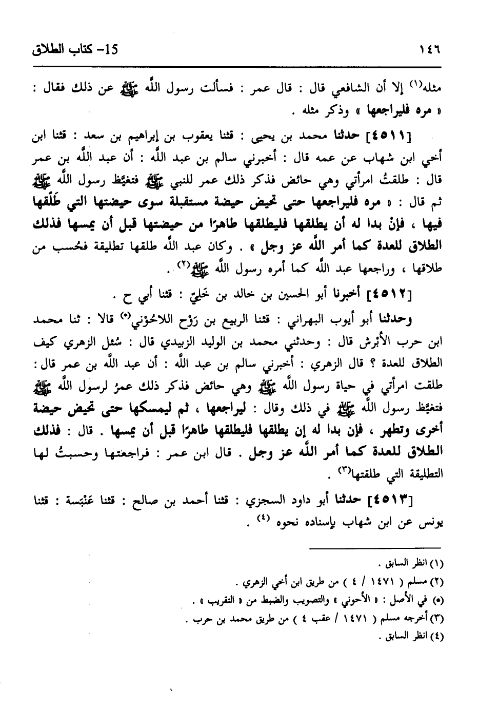 4511 - حَدَّثَنَا مُحَمَّدُ بْنُ يَحْيَى، قثنا يَعْقُوبُ بْنُ إِبْرَاهِيمَ بْنِ سَعْدٍ، قثنا ابْنُ أَخِي ابْنِ شِهَابٍ، عَنْ عَمِّهِ، قَالَ: أَخْبَرَنِي سَالِمُ بْنُ عَبْدِ اللَّهِ، أَنَّ عَبْدَ اللَّهِ بْنَ عُمَرَ، قَالَ: طَلَّقْتُ امْرَأَتِي وَهِيَ حَائِضٌ، فَذَكَرَ ذَلِكَ عُمَرُ لِلنَّبِيِّ صَلَّى اللهُ عَلَيْهِ وَسَلَّمَ، فَتَغَيَّظَ رَسُولُ اللَّهِ صَلَّى اللهُ عَلَيْهِ وَسَلَّمَ، ثُمَّ قَالَ: «§مُرْهُ فَلْيُرَاجِعْهَا حَتَّى تَحِيضَ حَيْضَةً مُسْتَقْبَلَةً سِوَى حَيْضَتِهَا الَّتِي طَلَّقَهَا فِيهَا، فَإِنْ بَدَا لَهُ أَنْ يُطَلِّقَهَا، فَلْيُطَلِّقْهَا طَاهِرًا مِنْ حَيْضَتِهَا قَبْلَ أَنْ يَمَسَّهَا، فَذَلِكَ الطَّلَاقُ لِلْعِدَّةِ كَمَا أَمَرَ اللَّهُ عَزَّ وَجَلَّ» . وَكَانَ عَبْدُ اللَّهِ طَلَّقَهَا تَطْلِيقَةً، فَحَسْبُ مِنْ طَلَاقِهَا وَرَاجَعَهَا عَبْدُ اللَّهِ كَمَا أَمَرَهُ رَسُولُ اللَّهِ صَلَّى اللهُ عَلَيْهِ وَسَلَّمَ "