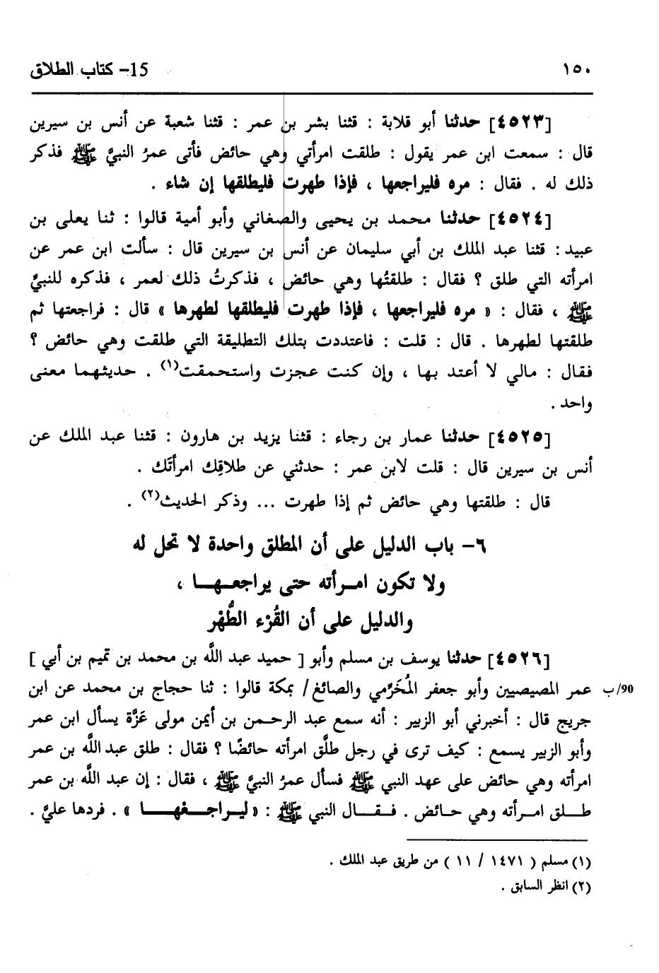 4523 - حَدَّثَنَا أَبُو قِلَابَةَ، قثنا بِشْرُ بْنُ عُمَرَ، قثنا شُعْبَةُ، عَنْ أَنَسِ بْنِ سِيرِينَ، قَالَ: سَمِعْتُ ابْنَ عُمَرَ، يَقُولُ: طَلَّقْتُ امْرَأَتِي وَهِيَ حَائِضٌ، فَأَتَى عُمَرُ النَّبِيَّ صَلَّى اللهُ عَلَيْهِ وَسَلَّمَ، فَذَكَرَ ذَلِكَ لَهُ، فَقَالَ: «§مُرْهُ فَلْيُرَاجِعْهَا، فَإِذَا طَهُرَتْ فَلْيُطَلِّقْهَا إِنْ شَاءَ»