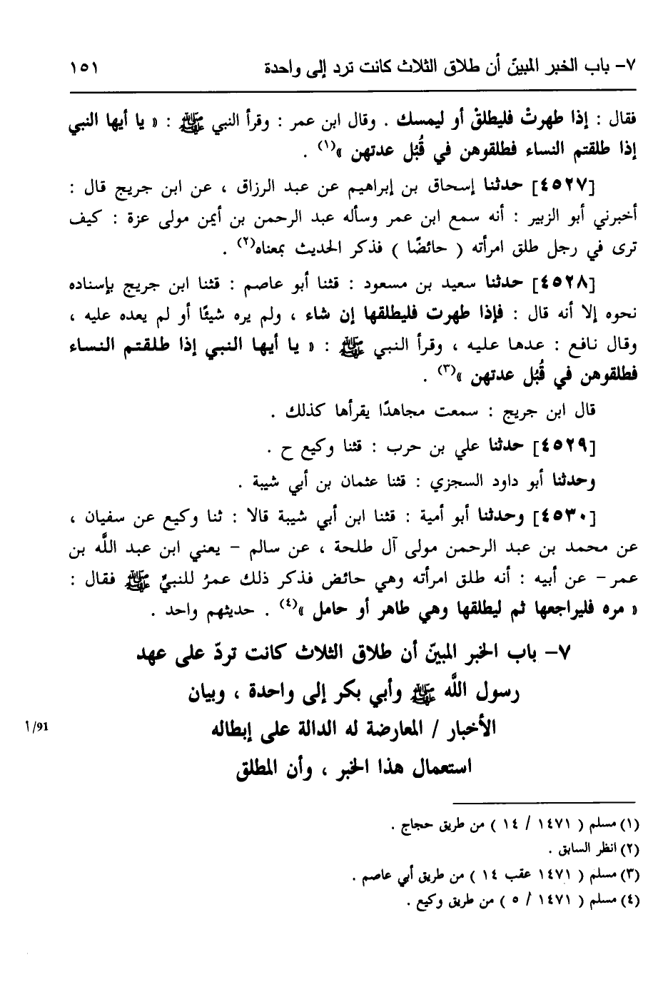 4530 - وَحَدَّثَنَا أَبُو أُمَيَّةَ، قثنا ابْنُ أَبِي شَيْبَةَ، قَالَا: ثَنَا وَكِيعٌ، عَنْ سُفْيَانَ، عَنْ مُحَمَّدِ بْنِ عَبْدِ الرَّحْمَنِ، مَوْلَى آلِ طَلْحَةَ عَنْ سَالِمٍ يَعْنِي ابْنَ عَبْدِ اللَّهِ بْنَ عُمَرَ، عَنْ أَبِيهِ، أَنَّهُ طَلَّقَ امْرَأَتَهُ وَهِيَ حَائِضٌ، فَذَكَرَ ذَلِكَ عُمَرُ لِلنَّبِيِّ صَلَّى اللهُ عَلَيْهِ وَسَلَّمَ، فَقَالَ: «§مُرْهُ فَلْيُرَاجِعْهَا، ثُمَّ لِيُطَلِّقْهَا وَهِيَ طَاهِرٌ أَوْ حَامِلٌ» حَدِيثُهُمْ وَاحِدٌ
