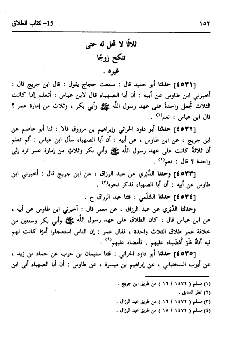 4532 - حَدَّثَنَا أَبُو دَاوُدَ الْحَرَّانِيُّ، وَإِبْرَاهِيمُ بْنُ مَرْزُوقٍ، قَالَا: ثَنَا أَبُو عَاصِمٍ، عَنِ ابْنِ جُرَيْجٍ، عَنِ ابْنِ طَاوُسٍ، عَنْ أَبِيهِ، أَنَّ أَبَا الصَّهْبَاءِ، سَأَلَ ابْنَ عَبَّاسٍ " §أَلَمْ تَعْلَمْ أَنَّ ثَلَاثَةً كَانَتْ عَلَى عَهْدِ رَسُولِ اللَّهِ صَلَّى اللهُ عَلَيْهِ وَسَلَّمَ وَأَبِي بَكْرٍ، وَثَلَاثٍ مِنْ إِمَارَةِ عُمَرَ تُرَدُّ إِلَى وَاحِدَةٍ؟ قَالَ: نَعَمْ "،