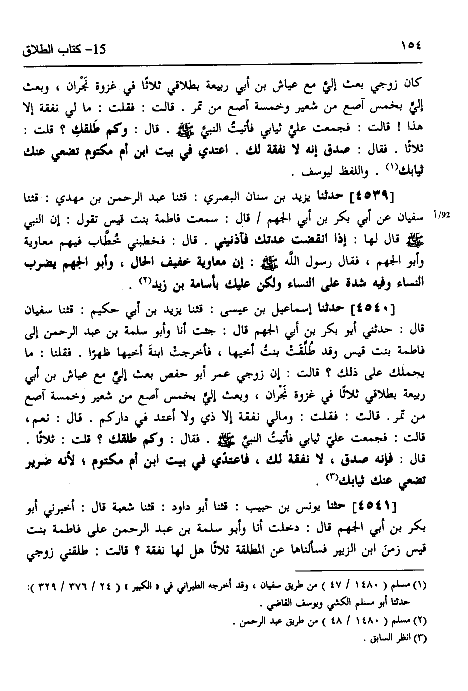 4540 - حَدَّثَنَا إِسْمَاعِيلُ بْنُ عِيسَى، قثنا يَزِيدُ بْنُ أَبِي حَكِيمٍ، قثنا سُفْيَانُ، قَالَ: حَدَّثَنِي أَبُو بَكْرِ بْنُ أَبِي الْجَهْمِ، قَالَ: جِئْتُ أَنَا وَأَبُو سَلَمَةَ بْنُ عَبْدِ الرَّحْمَنِ إِلَى فَاطِمَةَ بِنْتِ قَيْسٍ وَقَدْ طُلِّقَتْ بِنْتُ أَخِيهَا، فَأَخْرَجَتِ ابْنَةَ أَخِيهَا ظَهْرًا، فَقُلْنَا: مَا يَحْمِلُكِ عَلَى ذَلِكَ؟، قَالَتْ: إِنَّ زَوْجِي عُمَرَ أَبَا حَفْصٍ بَعَثَ إِلَيَّ مَعَ عَيَّاشِ بْنِ أَبِي رَبِيعَةَ بِطَلَاقِي ثَلَاثًا فِي غَزْوَةِ نَجْرَانَ، وَبَعَثَ إِلَيَّ بِخَمْسِ آصُعٍ مِنْ شَعِيرٍ، وَخَمْسَةِ آصُعٍ مِنْ تَمْرٍ، قَالَتْ: فَقُلْتُ: وَمَالِي نَفَقَةٌ إِلَّا ذِي، وَلَا أَعْتَدُّ فِي دَارَكُمْ، قَالَ: نَعَمْ قَالَتْ: فَجَمَعْتُ عَلِيَّ ثِيَابِي، فَأَتَيْتُ النَّبِيَّ صَلَّى اللهُ عَلَيْهِ وَسَلَّمَ، فَقَالَ: «§وَكَمْ طَلَّقَكِ؟» قُلْتُ: ثَلَاثًا، قَالَ: فَإِنَّهُ صَدَقَ لَا نَفَقَةَ لَكِ، فَاعْتَدِّي فِي بَيْتِ ابْنِ أُمِّ مَكْتُومٍ، لِأَنَّهُ ضَرِيرٌ تَضَعِي عَنْكِ ثِيَابَكِ "