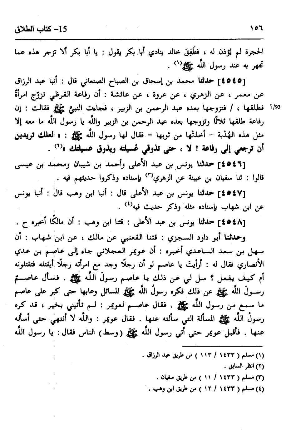 4545 - حَدَّثَنَا مُحَمَّدُ بْنُ إِسْحَاقَ بْنِ الصَّبَّاحِ الصَّنْعَانِيُّ، قَالَ: أنبا عَبْدُ الرَّزَّاقِ، عَنْ مَعْمَرٍ، عَنِ الزُّهْرِيِّ، عَنْ عُرْوَةَ، عَنْ عَائِشَةَ، أَنَّ رِفَاعَةَ الْقُرَظِيَّ، تَزَوَّجَ امْرَأَةً، فَطَلَّقَهَا، فَتَزَوَّجَهَا بَعْدَهُ عَبْدُ الرَّحْمَنِ بْنُ الزُّبَيْرِ، فَجَاءَتِ النَّبِيَّ صَلَّى اللهُ عَلَيْهِ وَسَلَّمَ، فَقَالَتْ: إِنَّ رِفَاعَةَ طَلَّقَهَا ثَلَاثًا وَتَزَوَّجَهَا بَعْدَهُ عَبْدُ الرَّحْمَنِ بْنُ الزُّبَيْرِ، وَاللَّهِ يَا رَسُولَ اللَّهِ، مَا مَعَهُ إِلَّا مِثْلُ هَذِهِ الْهُدْبَةِ أَخَذَتْهَا مِنْ ثَوْبِهَا، فَقَالَ لَهَا رَسُولُ اللَّهِ صَلَّى اللهُ عَلَيْهِ وَسَلَّمَ: «§لَعَلَّكِ تُرِيدِينَ أَنْ تَرْجِعِي إِلَى رِفَاعَةَ لَا حَتَّى تَذُوقِي عُسَيْلَتَهُ وَيَذُوقَ عُسَيْلَتَكِ» ،