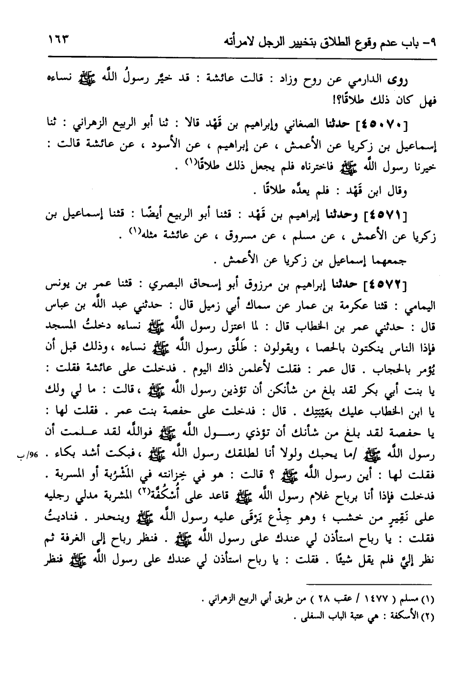 4570 - حَدَّثَنَا الصَّغَانِيُّ، وَإِبْرَاهِيمُ بْنُ قَهْدٍ، قَالَا: ثَنَا أَبُو الرَّبِيعِ الزَّهْرَانِيُّ، ثَنَا إِسْمَاعِيلُ بْنُ زَكَرِيَّا، عَنِ الْأَعْمَشِ، عَنْ إِبْرَاهِيمَ، عَنِ الْأَسْوَدِ، عَنْ عَائِشَةَ، قَالَتْ: " §خَيَّرَنَا رَسُولُ اللَّهِ صَلَّى اللهُ عَلَيْهِ وَسَلَّمَ، فَاخْتَرْنَاهُ، فَلَمْ يَجْعَلْ ذَلِكَ طَلَاقًا، وَقَالَ ابْنُ قَهْدٍ: فَلَمْ يَعُدَّهُ طَلَاقا "،