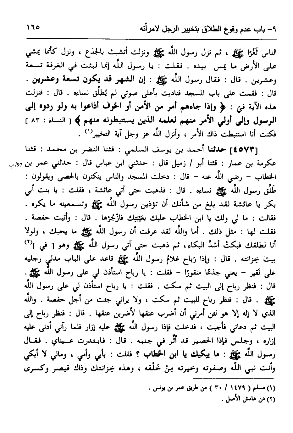 4573 - حَدَّثَنَا أَحْمَدُ بْنُ يُوسُفَ السُّلَمِيُّ، قثنا النَّضْرُ بْنُ مُحَمَّدٍ، قثنا عِكْرِمَةُ بْنُ عَمَّارٍ، قثنا أَبُو زُمَيْلٍ، قَالَ: حَدَّثَنِي ابْنُ عَبَّاسٍ، قَالَ: حَدَّثَنِي عُمَرُ بْنُ الْخَطَّابِ رَضِيَ اللَّهُ عَنْهُ قَالَ: §دَخَلْتُ الْمَسْجِدَ وَالنَّاسُ يَنْكُتُونَ بِالْحَصَى، وَيَقُولُونَ طَلَّقَ رَسُولُ اللَّهِ صَلَّى اللهُ عَلَيْهِ وَسَلَّمَ نِسَاءَهُ، قَالَ: فَذَهَبْتُ حَتَّى آتِيَ عَائِشَةَ، فَقُلْتُ: يَا بِنْتَ أَبِي بَكْرٍ يَا عَائِشَةُ، لَقَدْ بَلَغَ مِنْ شَأْنِكِ أَنْ تُؤْذِينَ رَسُولَ اللَّهِ صَلَّى اللهُ عَلَيْهِ وَسَلَّمَ وَتُسْمِعِينَهُ مَا يَكْرَهُ، فَقَالَتْ: مَا لِي وَلَكَ يَا ابْنَ الْخَطَّابِ؟ عَلَيْكَ بِعَيْبَتِكَ، فَازْجُرْهَا، قَالَ: وَأَتَيْتُ حَفْصَةَ، فَقُلْتُ لَهَا مِثْلَ ذَلِكَ: أَمَا وَاللَّهِ لَقَدْ عَرَفْتُ أَنَّ رَسُولَ اللَّهِ صَلَّى اللهُ عَلَيْهِ وَسَلَّمَ مَا يُحِبُّكِ وَلَوْلَا أَنَا لَطَلَّقَكِ، فَبَكَتْ أَشَدَّ الْبُكَاءِ، ثُمَّ ذَهَبْتُ، حَتَّى آتِيَ رَسُولَ اللَّهِ صَلَّى اللهُ عَلَيْهِ وَسَلَّمَ وَهُوَ فِي بَيْتِ خِزَانَتِهِ، قَالَ: وَإِذَا رَبَاحٌ غُلَامُ رَسُولِ اللَّهِ صَلَّى اللهُ عَلَيْهِ وَسَلَّمَ قَاعِدٌ عَلَى الْبَابِ مُدَلًّى رِجْلَيْهِ عَلَى نَقِيرٍ، يَعْنِي جِذْعًا مَنْقُورًا، فَقُلْتُ: يَا رَبَاحُ، اسْتَأْذِنْ لِي عَلَى رَسُولِ اللَّهِ صَلَّى اللهُ عَلَيْهِ وَسَلَّمَ، قَالَ: فَنَظَرَ رَبَاحٌ إِلَى الْبَيْتِ، ثُمَّ سَكَتَ، فَقُلْتُ: يَا رَبَاحُ اسْتَأْذِنْ لِي عَلَى رَسُولِ اللَّهِ صَلَّى اللهُ عَلَيْهِ وَسَلَّمَ، قَالَ: فَنَظَرَ رَبَاحٌ لِلْبَيْتِ، ثُمَّ سَكَتَ، وَلَا يَرَانِي جِئْتُ مِنْ أَجْلِ حَفْصَةَ وَاللَّهِ الَّذِي لَا إِلَهَ إِلَّا هُوَ لَئِنْ أَمَرَنِي أَنْ أَضْرِبَ عُنُقَهَا لَأَضْرِبَنَّ عُنُقَهَا، قَالَ: فَنَظَرَ رَبَاحٌ إِلَى الْبَيْتِ، ثُمَّ دَعَانِي، فَأَجَبْتُ، فَدَخَلْتُ، فَإِذَا رَسُولُ اللَّهِ صَلَّى اللهُ عَلَيْهِ وَسَلَّمَ عَلَيْهِ إِزَارٌ، فَلَمَّا رَآنِي أَدْنَى عَلَيْهِ إِزَارَهُ، وَجَلَسَ، فَإِذَا الْحَصِيرُ قَدْ أَثَّرَ فِي جَنْبِهِ، قَالَ: فَابْتَدَرَتْ عَيْنَايَ، فَقَالَ رَسُولُ اللَّهِ صَلَّى اللهُ عَلَيْهِ وَسَلَّمَ: «مَا يُبْكِيكَ يَا ابْنَ الْخَطَّابِ؟» ، فَقُلْتُ: بِأَبِي، وَأُمِّي، وَمَالِي لَا أَبْكِي، وَأَنْتَ نَبِيُّ اللَّهِ وَصَفْوَتُهُ، وَخِيرَتُهُ مِنْ خَلْقِهِ وَهَذِهِ خِزَانَتُكَ وَذَاكَ قَيْصَرُ وَكِسْرَى -[166]-، وَالْأَعَاجِمُ عِنْدَهُمُ الْأَنْهَارُ، وَيَأْكُلُونَ الثِّمَارَ، فَقَالَ: «يَا ابْنَ الْخَطَّابِ أَوَ مَا تَرْضَى أَنْ تَكُونَ لَهُمُ الدُّنْيَا وَلَنَا الْآخِرَةُ؟» ، قُلْتُ: بَلَى بِأَبِي، وَأُمِّي لَعَلَّكَ تَرَانِي جِئْتُ مِنْ أَجْلِ حَفْصَةَ، وَاللَّهِ لَئِنْ أَمَرْتَنِي أَنْ أَضْرِبَ عُنُقَهَا لَضَرَبْتُهُ، قَالَ: وَقَدْ دَخَلْتُ عَلَيْهِ وَهُوَ مُغْضَبٌ، فَمَا زِلْتُ عَلَيْهِ حَتَّى حَسِرَ عَنْهُ وَبَدَتْ نَوَاجِذُهُ، قَالَ: فَكَانَ أَحْسَنَ النَّاسِ ثَغْرًا فَقُلْتُ: يَا رَسُولَ اللَّهِ، أَطَلَّقْتَ نِسَاءَكَ؟ فَإِنْ كُنْتَ طَلَّقْتَ نِسَاءَكَ، فَإِنَّ اللَّهَ عَزَّ وَجَلَّ مَعَكَ وَمَلَائِكَتَهُ وَجِبْرِيلَ، وَأَنَا وَأَبُو بَكْرٍ، وَالْمُؤْمِنُونَ، قَالَ: وَذَلِكَ مِنْ قَبْلِ أَنْ يُنْزِلَ اللَّهُ عَزَّ وَجَلَّ هَذِهِ الْآيَةَ: {وَإِنْ تَظَاهَرَا عَلَيْهِ فَإِنَّ اللَّهَ هُوَ مَوْلَاهُ وَجِبْرِيلُ وَصَالِحُ الْمُؤْمِنِينَ وَالْمَلَائِكَةُ بَعْدَ ذَلِكَ ظُهَيْرٌ} [التحريم: 4] قَالَ: فَأَنْزَلَهَا اللَّهُ عَزَّ وَجَلَّ فِي قَوْلِ عُمَرَ، فَقُلْتُ: إِنِّي دَخَلْتُ الْمَسْجِدَ الْآنَ، وَهُمْ يَنْكُتُونَ بِالْحَصَى، وَيَقُولُ