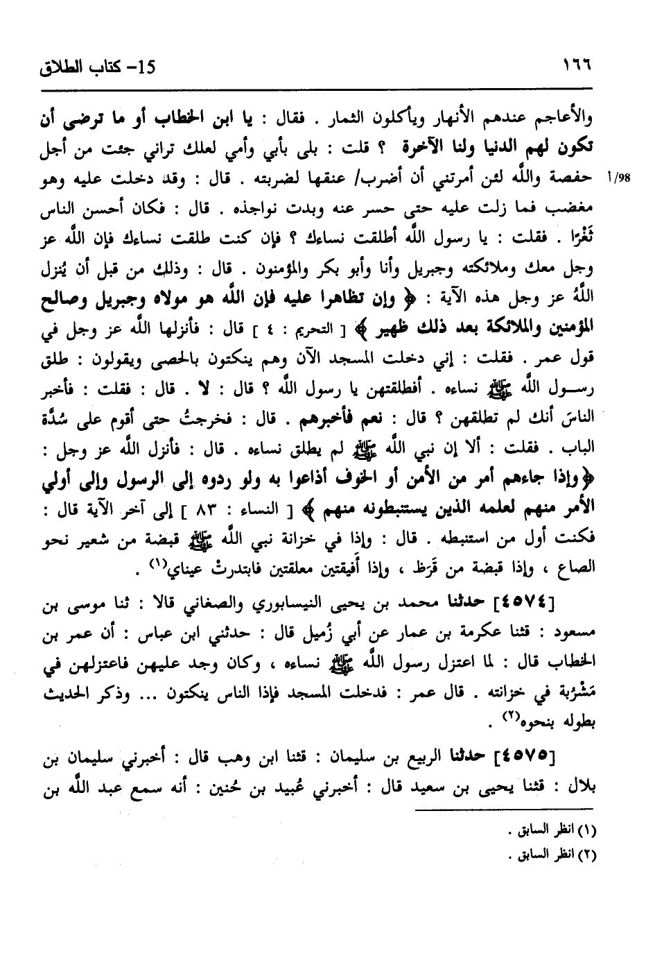 4575 - حَدَّثَنَا الرَّبِيعُ بْنُ سُلَيْمَانَ، قثنا ابْنُ وَهْبٍ، قَالَ: أَخْبَرَنِي سُلَيْمَانُ بْنُ بِلَالٍ، قثنا يَحْيَى بْنُ سَعِيدٍ، قَالَ: أَخْبَرَنِي عُبَيْدُ بْنُ حُنَيْنٍ، أَنَّهُ سَمِعَ عَبْدَ اللَّهَ بْنَ -[167]- عَبَّاسٍ، يُحَدِّثُ قَالَ: §مَكَثْتُ سَنَةً وَأَنَا أُرِيدُ أَنْ أَسْأَلَ عُمَرَ بْنَ الْخَطَّابِ عَنْ آيَةٍ، فَلَا أَسْتَطِيعُ أَنْ أَسْأَلَهُ هَيْبَةً لَهُ، حَتَّى خَرَجَ حَاجًّا، فَخَرَجْتُ مَعَهُ، فَلَمَّا رَجَعَ، فَكُنَّا بِبَعْضِ الطَّرِيقِ عَدَلَ إِلَى الْأَرَاكِ فِي حَاجَةٍ، فَوَقَفْتُ لَهُ حَتَّى فَرَغَ، ثُمَّ سِرْتُ مَعَهُ، فَقُلْتُ: يَا أَمِيرَ الْمُؤْمِنِينَ مِنَ اللَّتَيْنِ تَظَاهَرَتَا عَلَى رَسُولِ اللَّهِ صَلَّى اللهُ عَلَيْهِ وَسَلَّمَ مِنْ أَزْوَاجِهِ؟ قَالَ: تِلْكُ حَفْصَةُ وَعَائِشَةُ، فَقُلْتُ لَهُ: وَاللَّهِ إِنْ كُنْتُ لَأُرِيدُ أَنْ أَسْأَلَكَ عَنْ هَذِهِ مُنْذُ سَنَةٍ، فَمَا أَسْتَطِيعُ هَيْبَةً لَكَ، قَالَ: فَلَا تَفْعَلْ مَا ظَنَنْتَ أَنَّ عِنْدِي مِنْ عَلْمٍ، فَسَلْنِي، فَإِنْ كُنْتُ أَعْلَمُهُ أَخْبَرْتُكَ، قَالَ: وَقَالَ عُمَرُ: وَاللَّهِ إِنْ كُنَّا فِي الْجَاهِلِيَّةِ مَا نَعُدُّ لِلنِّسَاءِ أَمْرًا، حَتَّى أَنْزَلَ اللَّهُ عَزَّ وَجَلَّ فِيهِنَّ مَا أَنْزَلَ، وَقَسَمَ لَهُنَّ مَا قَسَمَ قَالَ: فَبَيْنَا أَنَا فِي أَمْرٍ أَتَأَمَّرُهُ، فَقَالَتْ لِي امْرَأَتِي: لَو صَنَعْتَ كَذَا وَكَذَا، فَقُلْتُ لَهَا: وَمَالَكِ أَنْتِ وَلِمَا هَاهُنَا؟ وَمَا تَكَلُّفُكِ فِي أَمْرٍ أُرِيدُهُ؟ فَقَالَتْ: وَاعَجَبًا لَكَ يَا ابْنَ الْخَطَّابِ مَا تُرِيدُ أَنْ تُرَاجَعَ أَنْتَ، وَإِنَّ ابْنَتَكَ لَتُرَاجِعُ رَسُولَ اللَّهِ صَلَّى اللهُ عَلَيْهِ وَسَلَّمَ، حَتَّى يَظَلَّ يَوْمَهُ غَضْبَانَ، قَالَ عُمَرُ: فَأَخَذْتُ رِدَائِي، ثُمَّ أَخْرُجُ مَكَانِي، حَتَّى أَدْخَلَ عَلَى حَفْصَةَ، فَقُلْتُ لَهَا: يَا بُنَيَّةُ إِنَّكِ لَتُرَاجِعِينَ رَسُولَ اللَّهِ صَلَّى اللهُ عَلَيْهِ وَسَلَّمَ، حَتَّى يَظَلَّ يَوْمَهُ غَضْبَانَ؟ فَقَالَتْ حَفْصَةُ: وَاللَّهِ إِنَّهُ لَنُرَاجِعَنَّهُ فَقُلْتُ: تَعْلَمِينَ أَنِّي أُحَذِّرُكِ عُقُوبَةَ اللَّهِ، وَغَضَبَ رَسُولِهِ، يَا بُنَيَّةُ لَا تَغُرَّنَّكِ هَذِهِ الَّتِي قَدْ أَعْجَبَهَا حُسْنُهَا، وَحُبُّ رَسُولِ اللَّهِ صَلَّى اللهُ عَلَيْهِ وَسَلَّمَ إِيَّاهَا، ثُمَّ خَرَجْتُ حَتَّى أَدْخُلَ عَلَى أُمِّ سَلَمَةَ لِقَرَابَتِي مِنْهَا، فَكَلَّمْتُهَا، فَقَالَتْ لِي أُمُّ سَلَمَةَ: عَجَبًا لَكَ يَا ابْنَ الْخَطَّابِ قَدْ دَخَلْتَ فِي كُلِّ شَيْءٍ، حَتَّى تَبْتَغِيَ أَنْ تَدْخُلَ بَيْنَ رَسُولِ اللَّهِ صَلَّى اللهُ عَلَيْهِ وَسَلَّمَ، وَبَيْنَ أَزْوَاجِهِ، فَأَخَذَتْنِي وَاللَّهِ أَخْذًا، فَكَسَرَتْنِي عَنْ بَعْضِ مَا كُنْتُ فِيهِ، وَكَانَ لِي صَاحِبٌ مِنَ الْأَنْصَارِ إِذَا غِبْتُ أَنَا أَتَانِي بِالْخَبَرِ، وَإِذَا غَابَ كُنْتُ أَنَا آتِيهِ بِالْخَبَرِ، وَنَحْنُ حِينَئِذٍ نَتَخَوَّفُ مِلِكًا مِنْ مُلُوكِ غَسَّانَ ذُكِرَ لَنَا أَنَّهُ يُرِيدُ أَنْ يَسِيرَ إِلَيْنَا، فَقَدِ امْتَلَأَتْ صُدُورُنَا مِنْهُ، فَأَتَانِي صَاحِبِي الْأَنْصَارِيُّ، فَدَقَّ الْبَابَ، فَقَالَ: افْتَحِ افْتَحْ، فَقُلْتُ: جَاءَ الْغَسَّانِيُّ، فَقَالَ أَشَدَّ مِنْ ذَلِكَ: عَزَلَ رَسُولُ اللَّهِ صَلَّى اللهُ عَلَيْهِ وَسَلَّمَ أَزْوَاجَهُ، فَقُلْتُ: رَغِمَ أَنْفُ حَفْصَةَ وَعَائِشَةَ، ثُمَّ أَخَذْتُ ثَوْبِي فَأَخْرُجُ، حَتَّى جِئْتُ، فَإِذَا رَسُولُ اللَّهِ صَلَّى اللهُ عَلَيْهِ وَسَلَّمَ فِي مَشْرُبَةٍ لَهُ يُرْتَقَى إِلَيْهَا بِعَجَلَةٍ، وَغُلَامٌ لِرَسُولِ اللَّهِ صَلَّى اللهُ عَلَيْهِ وَسَلَّمَ أَسْوَدُ عَلَى -[168]- رَأْسِ الدَ