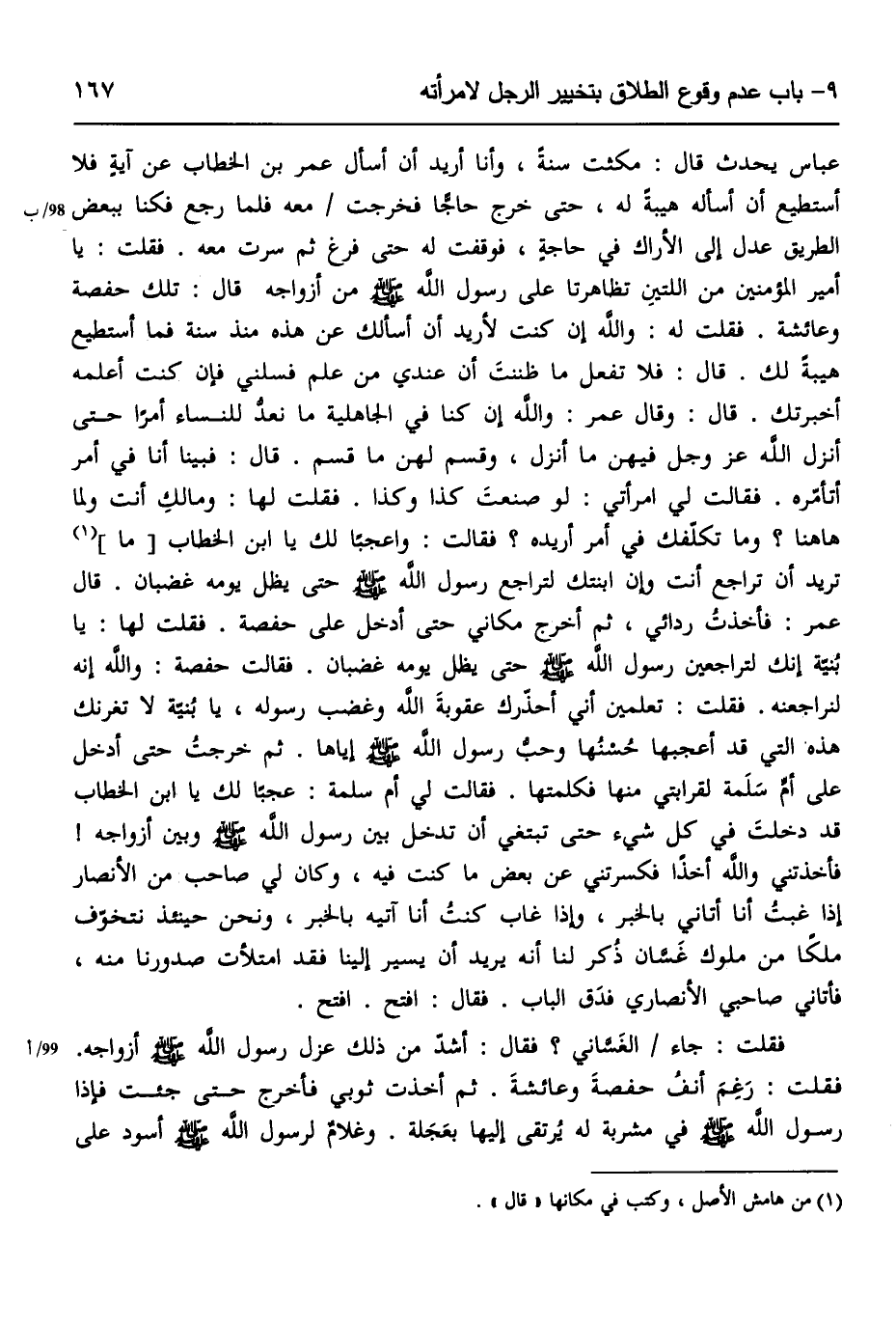 4575- حَدَّثَنَا الرَّبِيعُ بْنُ سُلَيْمَانَ ، قَالَ : حَدَّثَنَا ابْنُ وَهْبٍ ، قَالَ : أَخْبَرَنِي سُلَيْمَانُ بْنُ بِلالٍ ، قَالَ : حَدَّثَنَا يَحْيَى بْنُ سَعِيدٍ ، قَالَ : أَخْبَرَنِي عُبَيْدُ بْنُ حُنَيْنٍ ، أَنَّهُ سَمِعَ عَبْدَ اللَّهَ بْنَ عَبَّاسٍ يُحَدِّثُ ، قَالَ : مَكَثْتُ سَنَةً ، وَأَنَا أُرِيدُ أَنْ أَسْأَلَ عُمَرَ بْنَ الْخَطَّابِ عَنْ آيَةٍ ، فَلا أَسْتَطِيعُ أَنْ أَسْأَلَهُ هَيْبَةً لَهُ ، حَتَّى خَرَجَ حَاجًّا ، فَخَرَجْتُ مَعَهُ ، فَلَمَّا رَجَعَ ، فَكُنَّا بِبَعْضِ الطَّرِيقِ عَدَلَ إِلَى الأَرَاكِ فِي حَاجَةٍ ، فَوَقَفْتُ لَهُ حَتَّى فَرَغَ ، ثُمَّ سِرْتُ مَعَهُ فَقُلْتُ : يَا أَمِيرَ الْمُؤْمِنِينَ مِنَ اللَّتَيْنِ تَظَاهَرَتَا عَلَى رَسُولِ اللهِ صَلَّى الله عَلَيهِ وسَلَّم مِنْ أَزْوَاجِهِ ؟ قَالَ : تِلْكُ حَفْصَةُ وَعَائِشَةُ فَقُلْتُ لَهُ : وَاللَّهِ إِنْ كُنْتُ لأُرِيدُ أَنْ أَسْأَلَكَ عَنْ هَذِهِ مُنْذُ سَنَةٍ ، فَمَا أَسْتَطِيعُ هَيْبَةً لَكَ قَالَ : فَلا تَفْعَلْ مَا ظَنَنْتَ أَنَّ عِنْدِي مِنْ عَلْمٍ ، فَسَلْنِي ، فَإِنْ كُنْتُ أَعْلَمُهُ أَخْبَرْتُكَ قَالَ : وَقَالَ عُمَرُ : وَاللَّهِ إِنْ كُنَّا فِي الْجَاهِلِيَّةِ مَا نَعُدُّ لِلنِّسَاءِ أَمْرًا ، حَتَّى أَنْزَلَ اللَّهُ عَزَّ وَجَلَّ فِيهِنَّ مَا أَنْزَلَ ، وَقَسَمَ لَهُنَّ مَا قَسَمَ قَالَ : فَبَيْنَا أَنَا فِي أَمْرٍ أَتَأَمَّرُهُ فَقَالَتْ لِي امْرَأَتِي : لَو صَنَعْتَ كَذَا وَكَذَا فَقُلْتُ لَهَا : وَمَالَكِ أَنْتِ وَلِمَا هَاهُنَا ؟ وَمَا تَكَلُّفُكِ فِي أَمْرٍ أُرِيدُهُ ؟ فَقَالَتْ : وَاعَجَبًا لَكَ يَا ابْنَ الْخَطَّابِ مَا تُرِيدُ أَنْ تُرَاجَعَ أَنْتَ ، وَإِنَّ ابْنَتَكَ لَتُرَاجِعُ رَسُولَ اللهِ صَلَّى الله عَلَيهِ وسَلَّم ، حَتَّى يَظَلَّ يَوْمَهُ غَضْبَانَ قَالَ عُمَرُ : فَأَخَذْتُ رِدَائِي ، ثُمَّ أَخْرُجُ مَكَانِي ، حَتَّى أَدْخَلَ عَلَى حَفْصَةَ فَقُلْتُ لَهَا : يَا بُنَيَّةُ إِنَّكِ لَتُرَاجِعِينَ رَسُولَ اللهِ صَلَّى الله عَلَيهِ وسَلَّم ، حَتَّى يَظَلَّ يَوْمَهُ غَضْبَانَ ؟ فَقَالَتْ حَفْصَةُ : وَاللَّهِ إِنَّهُ لَنُرَاجِعَنَّهُ فَقُلْتُ : تَعْلَمِينَ أَنِّي أُحَذِّرُكِ عُقُوبَةَ اللهِ ، وَغَضِبَ رَسُولِهِ ، يَا بُنَيَّةُ لا تَغُرَّنَّكِ هَذِهِ الَّتِي قَدْ أَعْجَبَهَا حُسْنُهَا ، وَحُبُّ رَسُولِ اللهِ صَلَّى الله عَلَيهِ وسَلَّم إِيَّاهَا ثُمَّ خَرَجْتُ حَتَّى أَدْخُلَ عَلَى أُمِّ سَلَمَةَ لِقَرَابَتِي مِنْهَا ، فَكَلَّمْتُهَا فَقَالَتْ لِي أُمُّ سَلَمَةَ : عَجَبًا لَكَ يَا ابْنَ الْخَطَّابِ قَدْ دَخَلْتَ فِي كُلِّ شَيْءٍ ، حَتَّى تَبْتَغِيَ أَنْ تَدْخُلَ بَيْنَ رَسُولِ اللهِ صَلَّى الله عَلَيهِ وسَلَّم ، وَبَيْنَ أَزْوَاجِهِ ، فَأَخَذَتْنِي وَاللَّهِ أَخْذًا ، فَكَسَرَتْنِي عَنْ بَعْضِ مَا كُنْتُ فِيهِ ، وَكَانَ لِي صَاحِبٌ مِنَ الأَنْصَارِ إِذَا غِبْتُ أَنَا أَتَانِي بِالْخَبَرِ ، وَإِذَا غَابَ كُنْتُ أَنَا آتِيهِ بِالْخَبَرِ ، وَنَحْنُ حِينَئِذٍ نَتَخَوَّفُ مَلِكًا مِنْ مُلُوكِ غَسَّانَ ذُكِرَ لَنَا أَنَّهُ يُرِيدُ أَنْ يَسِيرَ إِلَيْنَا ، فَقَدِ امْتَلأَتْ صُدُورُنَا مِنْهُ ، فَأَتَانِي صَاحِبِي الأَنْصَارِيُّ ، فَدَقَّ الْبَابَ فَقَالَ : افْتَحِ افْتَحْ فَقُلْتُ : جَاءَ الْغَسَّانِيُّ ، فَقَالَ أَشَدَّ مِنْ ذَلِكَ : عَزَلَ رَسُولُ اللهِ صَلَّى الله عَلَيهِ وسَلَّم أَزْوَاجَهُ فَقُلْتُ : رَغِمَ أَنْفُ حَفْصَةَ وَعَائِشَةَ ثُمَّ أَخَذْتُ ثَوْبِي فَأَخْرُجُ ، حَتَّى جِئْتُ ، فَإِذَا رَسُولُ اللهِ صَلَّى الله عَلَيهِ وسَلَّم فِي مَشْرُبَةٍ لَهُ يُرْتَقَى إِلَيْهَا بِعَجَلَةٍ وَغُلامٌ لِرَسُولِ اللهِ صَلَّى الله عَلَيهِ وسَلَّم أَسْوَدُ عَلَى رَأْسِ الدَّرَجَةِ ، فَقُلْتُ : هَذَا ع
