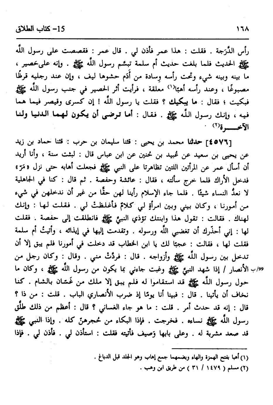 4576 - حَدَّثَنَا مُحَمَّدُ بْنُ يَحْيَى، قثنا سُلَيْمَانُ بْنُ حَرْبٍ، قثنا حَمَّادُ بْنُ زَيْدٍ، عَنْ يَحْيَى بْنِ سَعِيدٍ، عَنْ عُبَيْدِ بْنِ حُنَيْنٍ، عَنِ ابْنِ عَبَّاسٍ، قَالَ: §لَبِثْتُ سَنَةً وَأَنَا أُرِيدُ أَنْ أَسْأَلَ عُمَرَ عَنِ الْمَرْأَتَيْنِ اللَّتَيْنِ تَظَاهَرَتَا عَلَى النَّبِيِّ صَلَّى اللهُ عَلَيْهِ وَسَلَّمَ، فَجَعَلْتُ أَهَابُهُ حَتَّى نَزَلَ مَرَّةً، فَدَخَلَ الْأَرَاكَ، فَلَمَّا خَرَجَ سَأَلْتُهُ، فَقَالَ: عَائِشَةُ وَحَفْصَةُ، ثُمَّ قَالَ: كُنَّا فِي الْجَاهِلِيَّةِ لَا نَعُدُّ النِّسَاءَ شَيْئًا، فَلَمَّا جَاءَ الْإِسْلَامُ رَأَيْنَا لَهُنَّ حَقا مِنْ غَيْرِ أَنْ نُدْخِلَهُنَّ فِي شَيْءٍ مِنْ أُمُورِنَا، وَكَانَ بَيْنِي وَبَيْنَ امْرَأَةٍ لِي كَلَامٌ، فَأَغْلَظَتْ لِي، فَقُلْتُ لَهَا: وَإِنَّكِ لَهُنَاكَ، فَقَالَتْ: تَقُولُ هَذَا، وَابْنَتُكَ تُؤْذِي النَّبِيَّ صَلَّى اللهُ عَلَيْهِ وَسَلَّمَ، فَانْطَلَقْتُ إِلَى حَفْصَةَ فَقُلْتُ لَهَا: إِنِّي أُحَذِّرُكِ أَنْ تُغْضِبِي اللَّهَ وَرَسُولَهُ، وَتَقَدَّمْتُ إِلَيْهَا فِي إِيذَائِهِ، وَأَتَيْتُ أُمَّ سَلَمَةَ، فَقُلْتُ لَهَا: فَقَالَتْ " عَجَبًا لَكَ يَا ابْنَ الْخَطَّابِ قَدْ دَخَلْتَ فِي أُمُورِنَا، فَلَمْ يَبْقَ إِلَّا أَنْ تَدْخُلَ بَيْنَ رَسُولِ اللَّهِ صَلَّى اللهُ عَلَيْهِ وَسَلَّمَ، وَأَزْوَاجِهِ، قَالَ: فَرَدَّتْ مِنِّي، وَقَالَ: وَكَانَ رَجُلٌ مِنَ الْأَنْصَارِ إِذَا شَهِدَ النَّبِيَّ صَلَّى اللهُ عَلَيْهِ وَسَلَّمَ، وَغِبْتُ جَاءَنِي بِمَا يَكُونُ مِنْ رَسُولِ اللَّهِ صَلَّى اللهُ عَلَيْهِ وَسَلَّمَ، وَكَانَ مَا حَوْلَ رَسُولِ اللَّهِ صَلَّى اللهُ عَلَيْهِ وَسَلَّمَ قَدِ اسْتَقَامُوا لَهُ، فَلَمْ يَبْقَ إِلَّا مَلِكٌ مِنْ غَسَّانَ بِالشَّامِ كُنَّا نَخَافُ أَنْ يَأْتِينَا، قَالَ: فَبَيْنَا أَنَا يَوْمًا إِذْ ضَرَبَ الْأَنْصَارِيُّ الْبَابَ، قُلْتُ: مَنْ ذَا؟ قَالَ: إِنَّهُ قَدْ حَدَثَ أَمْرٌ، قُلْتُ: مَا هُوَ؟ جَاءَ الْغَسَّانِيُّ؟ قَالَ: أَعْظَمُ مِنْ ذَلِكَ طَلَّقَ رَسُولُ اللَّهِ صَلَّى اللهُ عَلَيْهِ وَسَلَّمَ نِسَاءَهُ، فَخَرَجْتُ، فَإِذَا الْبُكَاءُ مِنْ حُجَرِهِنَّ كُلِّهِ، وَإِذَا النَّبِيُّ صَلَّى اللهُ عَلَيْهِ وَسَلَّمَ قَدْ صَعِدَ مَشْرُبَةً لَهُ، وَعَلَى بَابِهَا وَصِيفٌ، فَأَتَيْتُهُ، فَقُلْتُ: اسْتَأْذِنْ لِي، فَأَذِنَ لِي، فَإِذَا -[169]- النَّبِيُّ صَلَّى اللهُ عَلَيْهِ وَسَلَّمَ تَحْتَ رَأْسِهِ مِرْفَقَةٌ مِنْ أَدَمٍ حَشْوُهَا لِيفٌ وَتَحْتَهُ حَصِيرٌ قَدْ أَثَّرَ فِي جَنْبِهِ، وَإِذَا أُهُبٌ مُعَلَّقَةٌ أُرَاهُ، قَالَ: وَقَرَظٌ مَنْبُوذٌ، قَالَ مُحَمَّدُ بْنُ يَحْيَى: الشَّكُّ مِنِّي، قَالَ: فَمَكَثَ تِسْعًا وَعِشْرِينَ لَيْلَةً، ثُمَّ نَزَلَ، قَالَ: وَبَلَغَنِي أَنَّ عَائِشَةَ، قَالَتْ: يَا رَسُولَ اللَّهِ، لَو أَخَذْتَ ذَاتَ الذَّنْبِ مِنَّا بِذَنْبِهَا، قَالَ: «إِذًا أَدَعُهَا كَأَنَّهَا شَاةٌ مِعْطَاءٌ»