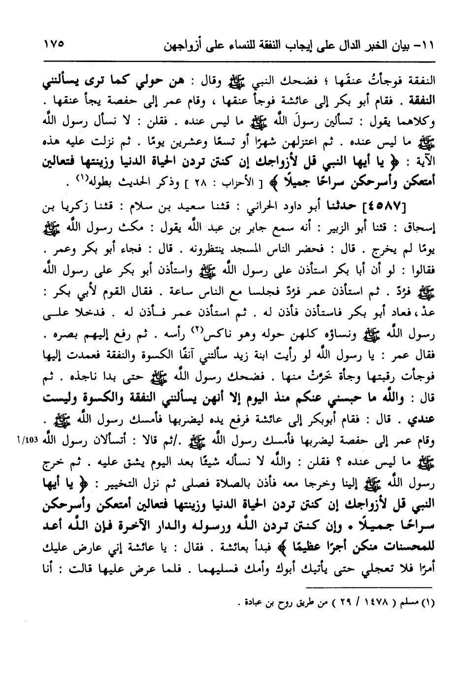 4587 - حَدَّثَنَا أَبُو دَاوُدَ الْحَرَّانِيُّ، قثنا سَعِيدُ بْنُ سَلَامٍ، قثنا زَكَرِيَّا بْنُ إِسْحَاقَ، قثنا أَبُو الزُّبَيْرِ، أَنَّهُ سَمِعَ جَابِرَ بْنَ عَبْدِ اللَّهِ، يَقُولُ: مَكَثَ رَسُولُ اللَّهِ صَلَّى اللهُ عَلَيْهِ وَسَلَّمَ يَوْمًا لَمْ يَخْرُجْ، قَالَ: فَحَضَرَ النَّاسُ الْمَسْجِدَ يَنْتَظِرُونَهُ، قَالَ: فَجَاءَ أَبُو بَكْرٍ وَعُمَرُ، فَقَالُوا: لَو أَنَّ أَبَا بَكْرٍ اسْتَأْذَنَ عَلَى رَسُولِ اللَّهِ صَلَّى اللهُ عَلَيْهِ وَسَلَّمَ وَاسْتَأْذَنَ أَبُو بَكْرٍ عَلَى رَسُولِ اللَّهِ صَلَّى اللهُ عَلَيْهِ وَسَلَّمَ فَرُدَّ، ثُمَّ اسْتَأْذَنَ عُمَرُ فَرُدَّ فَجَلَسَا مَعَ النَّاسِ سَاعَةً، فَقَالَ الْقَوْمُ لِأَبِي بَكْرٍ: عُدْ، فَعَادَ أَبُو بَكْرٍ فَاسْتَأْذَنَ، فَأُذِنَ لَهُ، ثُمَّ اسْتَأْذَنَ عُمَرُ، فَأُذِنَ لَهُ، فَدَخَلَا عَلَى رَسُولِ اللَّهِ صَلَّى اللهُ عَلَيْهِ وَسَلَّمَ وَنِسَاؤُهُ كُلُّهُنَّ حَوْلَهُ، وَهُوَ نَاكِسٌ رَأْسَهُ، ثُمَّ رَفَعَ إِلَيْهِمْ بَصَرَهُ، فَقَالَ عُمَرُ: يَا رَسُولَ اللَّهِ، لَو رَأَيْتَ ابْنَةَ زَيْدٍ سَأَلْتَنِي آنْفًا الْكِسْوَةَ وَالنَّفَقَةَ، فَعَمَدْتُ إِلَيْهَا، فَوَجَأْتُ رَقَبَتَهَا وَجْأَةً خَرَّتْ مِنْهَا، فَضَحِكَ رَسُولُ اللَّهِ صَلَّى اللهُ عَلَيْهِ وَسَلَّمَ حَتَّى بَدَا نَاجِذُهُ، ثُمَّ قَالَ: «وَاللَّهِ مَا حَبَسَنِي عَنْكُمْ مُنْذُ الْيَوْمِ إِلَّا أَنَّهُنَّ يَسْأَلْنَنِي النَّفَقَةَ وَالْكِسْوَةَ وَلَيْسَتْ عِنْدِي» ، قَالَ: فَقَامَ أَبُو بَكْرٍ إِلَى عَائِشَةَ، فَرَفَعَ يَدَهُ لِيَضْرِبَهَا، فَأَمْسَكَ رَسُولُ اللَّهِ صَلَّى اللهُ عَلَيْهِ وَسَلَّمَ، وَقَامَ عُمَرُ إِلَى حَفْصَةَ لِيَضْرِبَهَا، فَأَمْسَكَ رَسُولُ اللَّهِ صَلَّى اللهُ عَلَيْهِ وَسَلَّمَ، ثُمَّ قَالَا: أَتَسْأَلَانِ رَسُولَ اللَّهِ صَلَّى اللهُ عَلَيْهِ وَسَلَّمَ مَا لَيْسَ عِنْدَهُ، فَقُلْنَ: وَاللَّهِ لَا نَسْأَلَهُ شَيْئًا بَعْدَ الْيَوْمِ يَشُقُّ عَلَيْهِ، ثُمَّ خَرَجَ رَسُولُ اللَّهِ صَلَّى اللهُ عَلَيْهِ وَسَلَّمَ إِلَيْنَا وَخَرَجَا مَعَهُ، فَأُذِّنَ بِالصَّلَاةِ فَصَلَّى، ثُمَّ نَزَلَ التَّخْيِيرُ {يَا أَيُّهَا النَّبِيُّ قُلْ لِأَزْوَاجِكَ إِنْ كُنْتُنَّ تُرِدْنَ الْحَيَاةَ الدُّنْيَا وَزِينَتَهَا فَتَعَالَيْنَ أُمَتِّعْكُنَّ وَأُسَرِّحْكُنَّ سَرَاحًا جَمِيلًا وَإِنْ كُنْتُنَّ تُرِدْنَ اللَّهَ وَرَسُولَهُ وَالدَّارَ الْآخِرَةَ فَإِنَّ اللَّهَ أَعَدَّ لِلْمُحْسِنَاتِ مِنْكُنَّ أَجْرًا عَظِيمًا} [الأحزاب: 29] ، فَبَدَأَ بِعَائِشَةَ، فَقَالَ: يَا عَائِشَةُ إِنِّي عَارِضٌ عَلَيْكِ أَمْرًا فَلَا، تَعْجَلِي حَتَّى يَأْتِيَكِ أَبُوكِ وَأُمُّكِ، فَسَلِيهِمَا فَلَمَّا عَرَضَ عَلَيْهَا قَالَتْ: أَنَا -[176]- أَسْتَشِيرُ فِيكَ أَبِي وَأُمِّي، فَأَنَا أَخْتَارُ اللَّهَ وَرَسُولَهُ، وَالدَّارَ الْآخِرَةَ وَأُحَرِّجُ عَلَيْكَ أَنْ تُخْبِرَ أَحَدًا مِنْ صَوَاحِبَاتِي مَاذَا قُلْتُ، فَقَالَ رَسُولُ اللَّهِ صَلَّى اللهُ عَلَيْهِ وَسَلَّمَ: «§مَعَاذَ اللَّهِ مِنْ ذَلِكَ إِنَّ اللَّهَ عَزَّ وَجَلَّ لَمْ يَبْعَثْنِي مُعَنِّفًا، وَلَا مُتَعَنِّتًا، وَلَكِنْ بَعَثَنِي مُعَلِّمًا مُيَسِّرًا، وَلَا تَسْأَلُنِي امْرَأَةٌ مِنْهُنَّ إِلَّا أَخْبَرْتُهَا أَنَّكِ اخْتَرْتَ اللَّهَ وَرَسُولَهُ وَالدَّارَ الْآخِرَةَ» ، ثُمَّ اسْتَقْبَلَهُنَّ، فَعَرَضَ عَلَيْهِنَّ، فَقُلْنَ مَا قَالَتْ عَائِشَةُ فَأَخْبَرَهُنَّ مَا قَالَتْ عَائِشَةُ، فَقُلْنَ: وَنَحْنُ قَدِ اخْتَرْنَا اللَّهَ وَرَسُولَهُ وَالدَّارَ الْآخِرَةَ "
