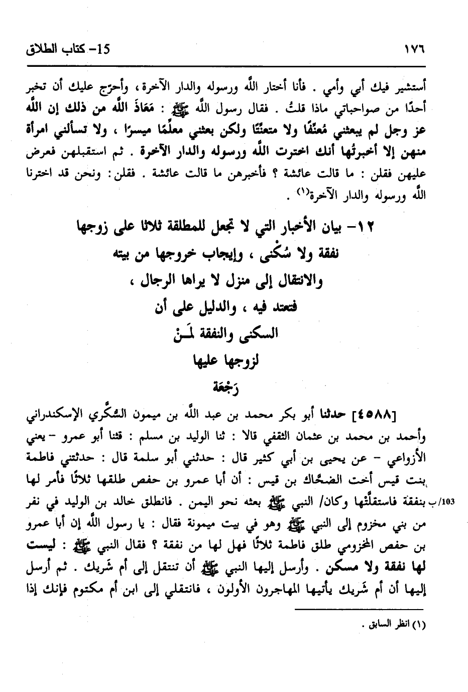 4588 - حَدَّثَنَا أَبُو بَكْرٍ، مُحَمَّدُ بْنُ عَبْدِ اللَّهِ بْنِ مَيْمُونٍ السُّكَّرِيُّ الْإِسْكَنْدَرَانِيُّ، وَأَحْمَدُ بْنُ مُحَمَّدِ بْنِ عُثْمَانَ الثَّقَفِيُّ، قَالَا: ثَنَا الْوَلِيدُ بْنُ مُسْلِمٍ، قثنا أَبُو عَمْرٍو يَعْنِي الْأَوْزَاعِيَّ، عَنْ يَحْيَى بْنِ أَبِي كَثِيرٍ، قَالَ: حَدَّثَنِي أَبُو سَلَمَةَ، قَالَ: حَدَّثَتْنِي فَاطِمَةُ بِنْتُ قَيْسٍ، أُخْتُ الضَّحَّاكِ بْنِ قَيْسٍ أَنَّ أَبَا عَمْرِو بْنَ حَفْصٍ، طَلَّقَهَا ثَلَاثًا فَأَمَرَ لَهَا بِنَفَقَةٍ، فَاسْتَقَلَّتْهَا وَكَانَ النَّبِيُّ صَلَّى اللهُ عَلَيْهِ وَسَلَّمَ بَعَثَهُ نَحْوَ الْيَمَنِ، فَانْطَلَقَ خَالِدُ بْنُ الْوَلِيدِ فِي نَفَرٍ مِنْ بَنِي مَخْزُومٍ إِلَى النَّبِيِّ صَلَّى اللهُ عَلَيْهِ وَسَلَّمَ وَهُوَ فِي بَيْتِ مَيْمُونَةَ، فَقَالَ: يَا رَسُولَ اللَّهِ، إِنَّ §أَبَا عَمْرِو بْنَ حَفْصٍ الْمَخْزُومِيَّ طَلَّقَ فَاطِمَةَ ثَلَاثًا، فَهَلْ لَهَا مِنْ نَفَقَةٍ؟، فَقَالَ النَّبِيُّ صَلَّى اللهُ عَلَيْهِ وَسَلَّمَ: «لَيْسَتْ لَهَا نَفَقَةٌ، وَلَا مَسْكَنٌ» ، وَأَرْسَلَ إِلَيْهَا النَّبِيُّ صَلَّى اللهُ عَلَيْهِ وَسَلَّمَ أَنْ تَنْتَقِلَ إِلَى أُمِّ شَرِيكٍ، ثُمَّ أَرْسَلَ إِلَيْهَا أَنَّ أُمَّ شَرِيكٍ يَأْتِيهَا الْمُهَاجِرُونَ الْأَوَّلُونَ، فَانْتَقِلِي إِلَى ابْنِ أُمِّ مَكْتُومٍ، فَإِنَّكِ إِذَا -[177]- وَضَعْتِ خِمَارَكِ لَمْ يَرَكِ، فَأَرْسَلَ إِلَيْهَا «لَا تَسْبِقِينَنِي بِنَفْسِكِ» ، فَزَوَّجَهَا النَّبِيُّ صَلَّى اللهُ عَلَيْهِ وَسَلَّمَ أُسَامَةَ "،