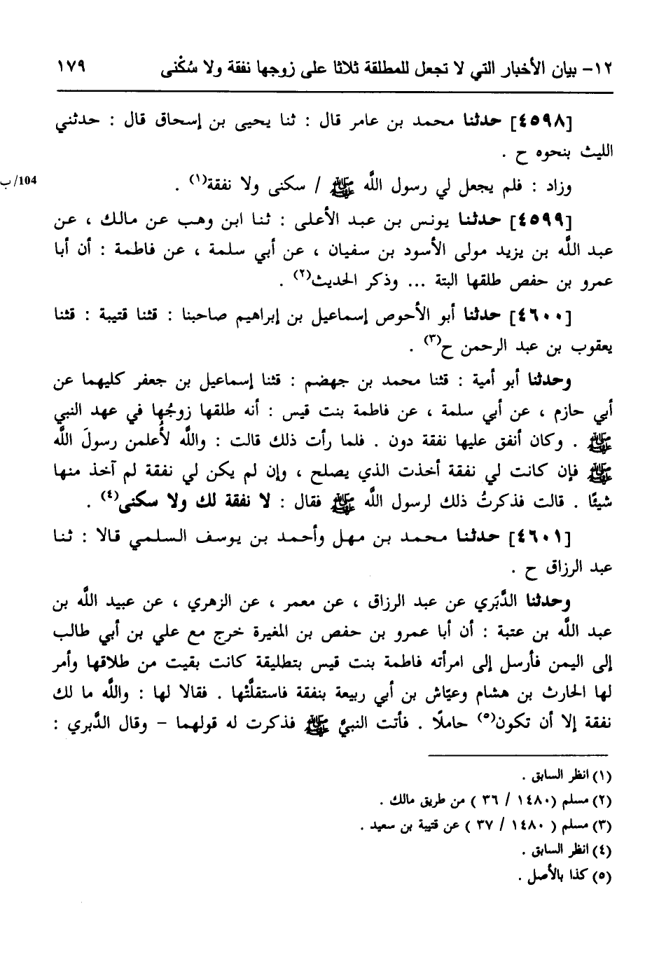4601 - حَدَّثَنَا مُحَمَّدُ بْنُ مُهِلٍّ، وَأَحْمَدُ بْنُ يُوسُفَ السُّلَمِيُّ، قَالَا: ثَنَا عَبْدُ الرَّزَّاقِ، ح وَحَدَّثَنَا الدَّبَرِيُّ، عَنْ عَبْدِ الرَّزَّاقِ، عَنْ مَعْمَرٍ، عَنِ الزُّهْرِيِّ، عَنْ عُبَيْدِ اللَّهِ بْنِ عَبْدِ اللَّهِ بْنِ عُتْبَةَ، أَنَّ أَبَا عَمْرِو بْنَ حَفْصِ بْنِ الْمُغِيرَةِ، خَرَجَ مَعَ عَلِيِّ بْنِ أَبِي طَالِبٍ إِلَى الْيَمَنِ، فَأَرْسَلَ إِلَى امْرَأَتِهِ فَاطِمَةَ بِنْتِ قَيْسٍ بِتَطْلِيقَةٍ كَانَتْ بَقِيَتْ مِنْ طَلَاقِهَا، وَأَمَرَ لَهَا الْحَارِثُ بْنُ هِشَامٍ وَعَيَّاشُ بْنُ أَبِي رَبِيعَةَ بِنَفَقَةٍ، فَاسْتَقَلَّتْهَا، فَقَالَا لَهَا: §وَاللَّهِ مَا لَكِ نَفَقَةٌ إِلَّا أَنْ تَكُونِي حَامِلًا، فَأَتَتِ النَّبِيَّ صَلَّى اللهُ عَلَيْهِ وَسَلَّمَ، فَذَكَرَتْ لَهُ قَوْلَهُمَا، وَقَالَ الدَّبَرِيُّ -[180]-: فَذَكَرَتْ لَهُ أَمْرَهَا، فَقَالَ لَهَا النَّبِيُّ صَلَّى اللهُ عَلَيْهِ وَسَلَّمَ: «لَا نَفَقَةَ لَكِ» وَاسْتَأْذَنَتْهُ فِي الِانْتِقَالِ، فَأَذِنَ لَهَا، فَقَالَتْ: أَيْنَ يَا رَسُولَ اللَّهِ؟ فَقَالَ: «إِلَى ابْنِ أُمِّ مَكْتُومٍ» ، وَكَانَ أَعْمَى تَضَعُ ثِيَابَهَا عِنْدَهُ، وَلَا يَرَاهَا، فَلَمَّا مَضَتْ عِدَّتُهَا أَنْكَحَهَا النَّبِيُّ صَلَّى اللهُ عَلَيْهِ وَسَلَّمَ أُسَامَةَ بْنَ زَيْدٍ فَأَرْسَلَ إِلَيْهَا مَرْوَانُ قَبِيصَةَ بْنَ ذُؤَيْبٍ يَسْأَلُهَا عَنْ هَذَا الْحَدِيثِ، فَحَدَّثَتْهُ بِهِ فَقَالَ مَرْوَانُ: لَمْ نَسْمَعْ هَذَا الْحَدِيثَ إِلَّا مِنَ امْرَأَةٍ سَنَأْخُذُ بِالْعِصْمَةِ الَّتِي وَجَدْنَا النَّاسَ عَلَيْهَا فَقَالَتْ فَاطِمَةُ حِينَ بَلَغَهَا قَوْلُ مَرْوَانَ: بَيْنِي وَبَيْنَكُمُ الْقُرْآنُ قَالَ اللَّهُ عَزَّ وَجَلَّ {لَا تُخْرِجُوهُنَّ مِنْ بُيُوتِهِنَّ وَلَا يَخْرُجْنَ إِلَّا أَنْ يَأْتِينَ بِفَاحِشَةٍ مُبَيِّنَةٍ} [الطلاق: 1] إِلَى قَوْلِهِ {لَعَلَّ اللَّهَ يُحَدِثُ بَعْدَ ذَلِكَ أَمْرًا} [الطلاق: 1] قَالَتْ: فَهَذَا لِمَنْ كَانَتْ لَهُ مُرَاجَعَةٌ فَأَيُّ أَمْرٍ يَحْدُثُ بَعْدَ الثَّلَاثَةِ فَكَيْفَ يَقُولُونَ لَا نَفَقَةَ لَهَا إِذَا لَمْ تَكُنْ حَامِلًا فَعَلَى مَا تَحْسَبُونَهَا؟ "