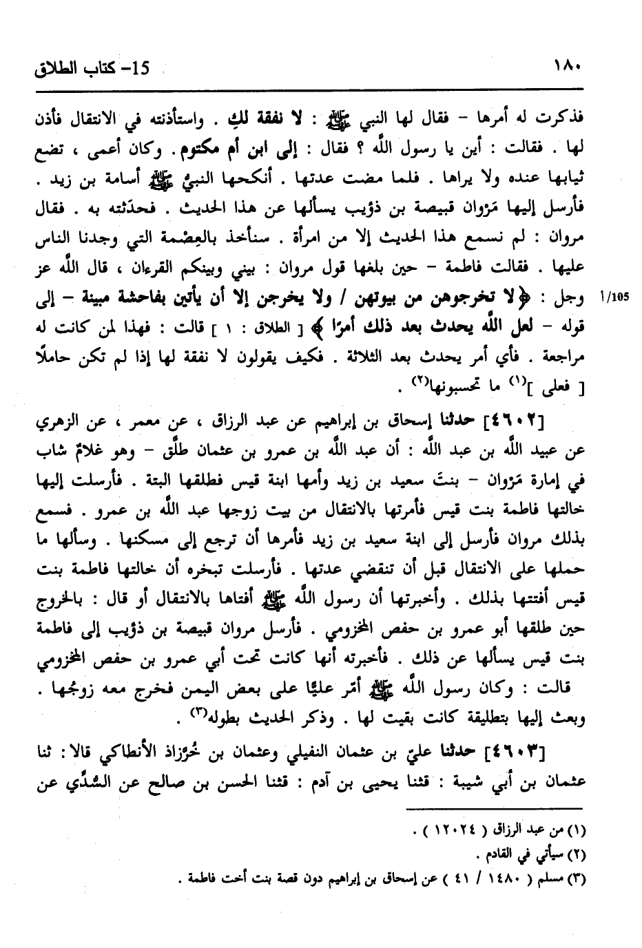 4602 - حَدَّثَنَا إِسْحَاقُ بْنُ إِبْرَاهِيمَ، عَنْ عَبْدِ الرَّزَّاقِ، عَنْ مَعْمَرٍ، عَنِ الزُّهْرِيِّ، عَنْ عُبَيْدِ اللَّهِ بْنِ عَبْدِ اللَّهِ، أَنَّ عَبْدَ اللَّهِ بْنَ عَمْرِو بْنِ عُثْمَانَ طَلَّقَ، وَهُوَ " §غُلَامٌ شَابٌّ فِي إِمَارَةِ مَرْوَانَ بِنْتَ سَعِيدِ بْنِ زَيْدٍ وَأُمُّهَا ابْنَةُ قَيْسٍ، فَطَلَّقَهَا الْبَتَّةَ، فَأَرْسَلَتْ إِلَيْهَا خَالَتُهَا فَاطِمَةُ بِنْتُ قَيْسٍ، فَأَمَرَتْهَا بِالِانْتِقَالِ مِنْ بَيْتِ زَوْجِهَا عَبْدِ اللَّهِ بْنِ عَمْرٍو، فَسَمِعَ بِذَلِكَ مَرْوَانُ، فَأَرْسَلَ إِلَى ابْنَةِ سَعِيدِ بْنِ زَيْدٍ، فَأَمَرَهَا أَنْ تَرْجِعَ إِلَى مَسْكَنِهَا، وَسَأَلَهَا مَا حَمَلَهَا عَلَى الِانْتِقَالِ قَبْلَ أَنْ تَنْقَضِيَ عِدَّتُهَا؟، فَأَرْسَلَتْ: تُخْبِرُهُ أَنَّ خَالَتِهَا فَاطِمَةَ بِنْتَ قَيْسٍ أَفْتَتْهَا بِذَلِكَ، وَأَخْبَرَتْهَا أَنَّ رَسُولَ اللَّهِ صَلَّى اللهُ عَلَيْهِ وَسَلَّمَ أَفْتَاهَا بِالِانْتِقَالِ، أَوْ قَالَ بِالْخُرُوجِ حِينَ طَلَّقَهَا أَبُو عَمْرِو بْنُ حَفْصٍ الْمَخْزُومِيُّ، فَأَرْسَلَ مَرْوَانُ قَبِيصَةَ بْنَ ذُؤَيْبٍ إِلَى فَاطِمَةَ بِنْتِ قَيْسٍ يَسْأَلُهَا عَنْ ذَلِكَ، فَأَخْبَرَتْهُ أَنَّهَا كَانَتْ تَحْتَ أَبِي عَمْرِو بْنِ حَفْصٍ الْمَخْزُومِيِّ، قَالَتْ: وَكَانَ رَسُولُ اللَّهِ صَلَّى اللهُ عَلَيْهِ وَسَلَّمَ أَمَّرَ عَلِيًّا عَلَى بَعْضِ الْيَمَنِ، فَخَرَجَ مَعَهُ زَوْجُهَا، وَبَعَثَ إِلَيْهَا بِتَطْلِيقَةٍ كَانَتْ بَقِيَتْ لَهَا وَذَكَرَ الْحَدِيثَ بِطُولِهِ "