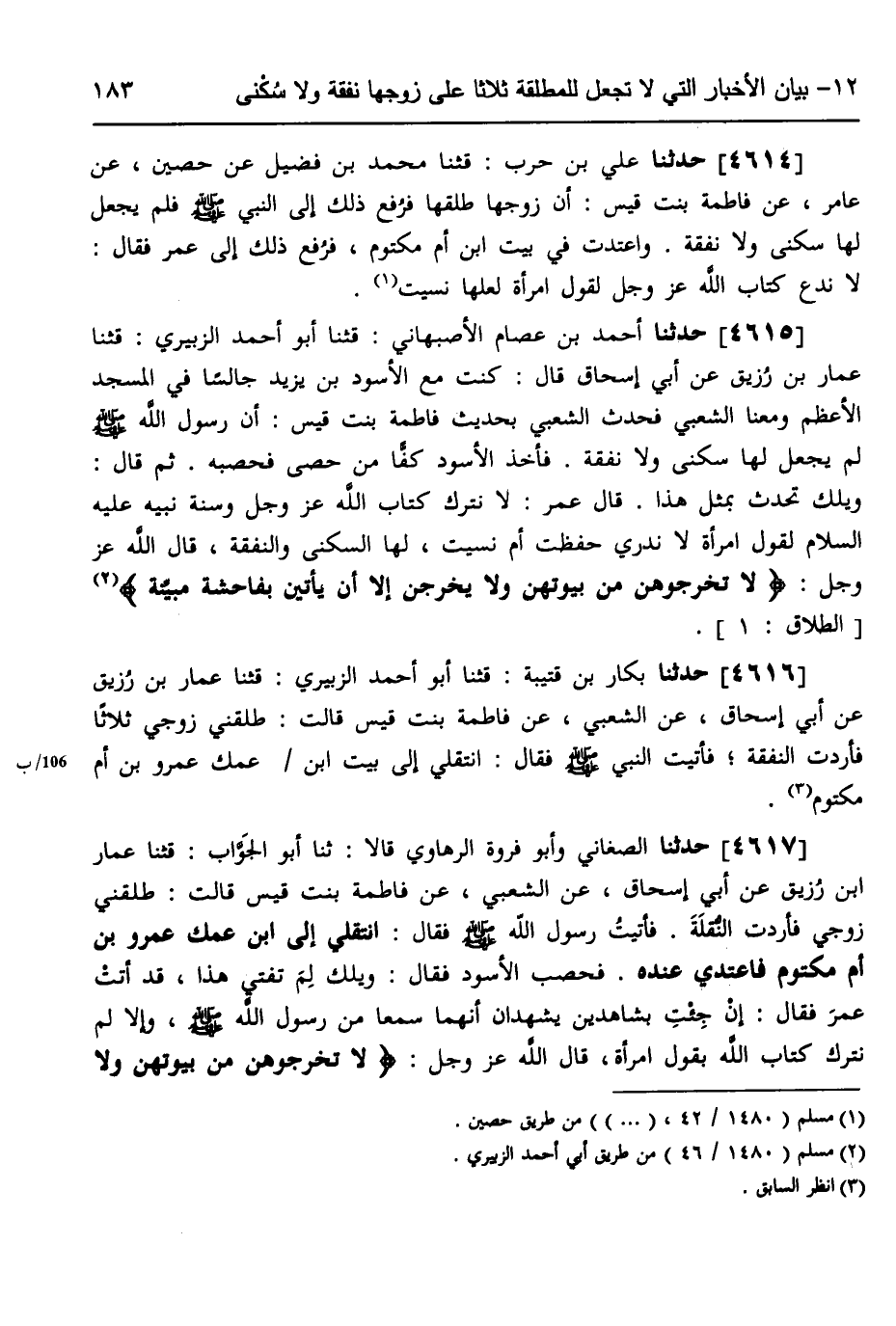 4617 - حَدَّثَنَا الصَّغَانِيُّ، وَأَبُو فَرْوَةَ الرُّهَاوِيُّ، قَالَا: ثَنَا أَبُو الْجَوَّابِ، قثنا عَمَّارُ بْنُ رُزَيْقٍ، عَنْ أَبِي إِسْحَاقَ، عَنِ الشَّعْبِيِّ، عَنْ فَاطِمَةَ بِنْتِ قَيْسٍ، قَالَتْ: " §طَلَّقَنِي زَوْجِي، فَأَرَدْتُ النُّقْلَةَ، فَأَتَيْتُ رَسُولَ اللَّهِ صَلَّى اللهُ عَلَيْهِ وَسَلَّمَ، فَقَالَ: «انْتَقِلِي إِلَى ابْنِ عَمِّكِ عَمْرِو بْنِ أُمِّ مَكْتُومٍ فَاعْتَدِّي عِنْدَهُ» ، فَحَصَبَ الْأَسْوَدُ، فَقَالَ: وَيْلَكَ لِمَ تُفْتِي هَذَا؟ قَدْ أَتَتْ عُمَرَ، فَقَالَ: إِنْ جِئْتِ بِشَاهِدَيْنِ يَشْهَدَانِ أَنَّهُمَا سَمِعَا مِنْ رَسُولِ اللَّهِ صَلَّى اللهُ عَلَيْهِ وَسَلَّمَ، وَإِلَّا لَمْ نَتْرُكْ كِتَابَ اللَّهِ بِقَوْلِ امْرَأَةٍ، قَالَ اللَّهِ عَزَّ وَجَلَّ {لَا تُخْرِجُوهُنَّ مِنْ بُيُوتِهِنَّ وَلَا -[184]- يَخْرُجْنَ إِلَّا أَنْ يَأْتِينَ بِفَاحِشَةٍ مُبَيِّنَةٍ} [الطلاق: 1] حَدِيثُهُمَا وَاحِدٌ "