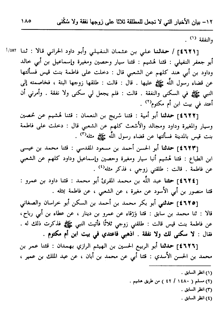 4621 - حَدَّثَنَا عَلِيُّ بْنُ عُثْمَانَ النُّفَيْلِيُّ، وَأَبُو دَاوُدَ الْحَرَّانِيُّ، قَالَا: ثَنَا أَبُو جَعْفَرٍ النُّفَيْلِيُّ، قثنا هُشَيْمٌ، قثنا سَيَّارٌ، وَحُصَيْنٌ، وَمُغِيرَةُ، وَإِسْمَاعِيلُ بْنُ أَبِي خَالِدٍ، وَدَاوُدُ بْنُ أَبِي هِنْدَ، كُلُّهُمْ عَنِ الشَّعْبِيِّ، قَالَ: دَخَلْتُ عَلَى فَاطِمَةَ بِنْتِ قَيْسٍ، فَسَأَلْتُهَا " §عَنْ قَضَاءِ رَسُولِ اللَّهِ صَلَّى اللهُ عَلَيْهِ وَسَلَّمَ عَلَيْهَا قَالَ: قَالَتْ: طَلَّقَهَا زَوْجُهَا الْبَتَّةَ، فَخَاصَمَتْهُ إِلَى النَّبِيِّ صَلَّى اللهُ عَلَيْهِ وَسَلَّمَ فِي السُّكْنَى وَالنَّفَقَةِ، قَالَتْ: فَلَمْ يَجْعَلْ لِي سُكْنَى وَلَا نَفَقَةً، وَأَمَرَنِي أَنْ أَعْتَدَّ فِي بَيْتِ ابْنِ أُمِّ مَكْتُومٍ "،