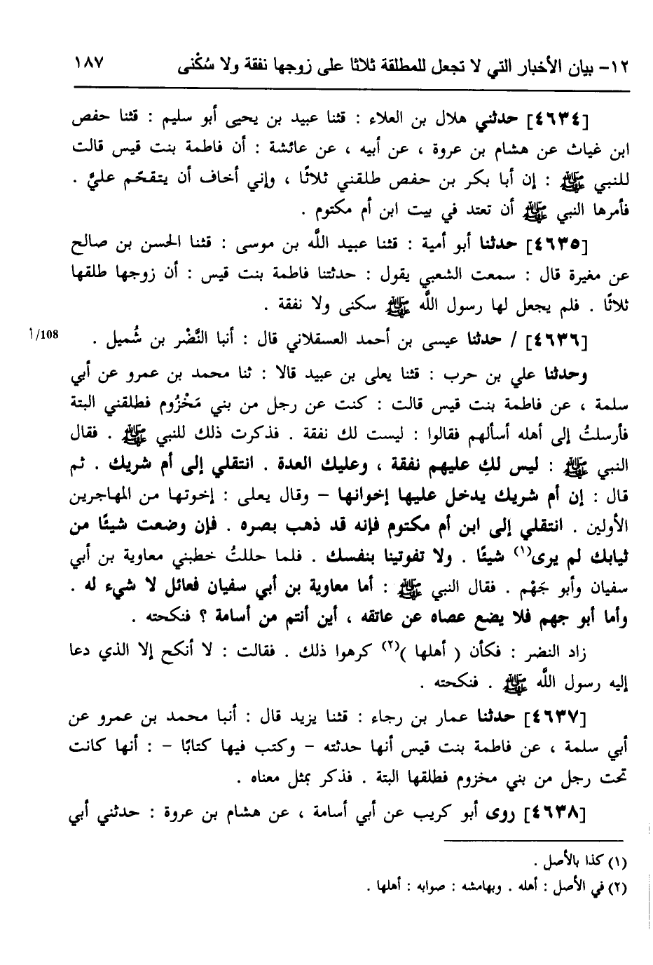 4636 - حَدَّثَنَا عِيسَى بْنُ أَحْمَدَ الْعَسْقَلَانِيُّ، قَالَ: أنبا النَّضْرُ بْنُ شُمَيْلٍ، وَحَدَّثَنَا عَلِيُّ بْنُ حَرْبٍ، قثنا يَعْلَى بْنُ عُبَيْدٍ، قَالَا: ثَنَا مُحَمَّدُ بْنُ عَمْرٍو، عَنْ أَبِي سَلَمَةَ، عَنْ فَاطِمَةَ بِنْتِ قَيْسٍ، قَالَتْ: §كُنْتُ عَنْ رَجُلٍ مِنْ بَنِي مَخْزُومٍ، فَطَلَّقَنِي الْبَتَّةَ، فَأَرْسَلْتُ إِلَى أَهْلِهِ أَسْأَلُهُمْ، فَقَالُوا: لَيْسَتْ لَكِ نَفَقَةٌ، فَذَكَرْتُ ذَلِكَ لِلنَّبِيِّ صَلَّى اللهُ عَلَيْهِ وَسَلَّمَ، فَقَالَ النَّبِيُّ صَلَّى اللهُ عَلَيْهِ وَسَلَّمَ: «لَيْسَ لَكِ عَلَيْهِمْ نَفَقَةٌ، وَعَلَيْكِ الْعِدَّةُ انْتَقِلِي إِلَى أُمِّ شَرِيكٍ» ، ثُمَّ قَالَ: «إِنَّ أُمَّ شَرِيكٍ يَدْخُلُ عَلَيْهَا إِخْوَانُهَا» ، وَقَالَ يَعْلَى: إِخْوَتُهَا مِنَ الْمُهَاجِرِينِ الْأَوَّلِينَ انْتَقِلِي إِلَى ابْنِ أُمِّ مَكْتُومٍ، فَإِنَّهُ قَدْ ذَهَبَ بَصَرَهُ، فَإِنْ وَضَعْتِ شَيْئًا مِنْ ثِيَابِكِ لَمْ يَرَ شَيْئًا، وَلَا تُفَوِّتِينَا بِنَفْسِكِ "، فَلَمَّا حَلَلْتُ خَطَبَنِي مُعَاوِيَةُ بْنُ أَبِي سُفْيَانَ وَأَبُو جَهْمٍ، فَقَالَ النَّبِيُّ صَلَّى اللهُ عَلَيْهِ وَسَلَّمَ: " أَمَا مُعَاوِيَةُ بْنُ أَبِي سُفْيَانَ فَعَائِلٌ لَا شَيْءَ لَهُ، وَأَمَّا أَبُو جَهْمٍ، فَلَا يَضَعُ عَصَاهُ عَنْ عَاتِقِهِ أَيْنَ أَنْتُمْ مِنْ أُسَامَةَ؟ فَنَكَحْتُهُ. زَادَ النَّضْرُ فَكَأَنَّ أَهْلَهَا كَرِهُوا ذَلِكَ، فَقَالَتْ: لَا أَنْكَحَ إِلَّا الَّذِي دَعَا إِلَيْهِ رَسُولُ اللَّهِ صَلَّى اللهُ عَلَيْهِ وَسَلَّمَ، فَنَكَحَتْهُ "،