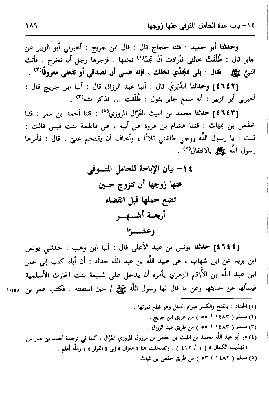 4644 - حَدَّثَنَا يُونُسُ بْنُ عَبْدِ الْأَعْلَى، قَالَ: أنبا ابْنُ وَهْبٍ، حَدَّثَنِي يُونُسُ بْنُ يَزِيدَ، عَنِ ابْنِ شِهَابٍ، عَنْ عُبَيْدِ اللَّهِ بْنِ عَبْدِ اللَّهِ، حَدَّثَهُ أَنَّ أَبَاهُ كَتَبَ إِلَى عُمَرَ بْنِ عَبْدِ اللَّهِ بْنِ الْأَرْقَمِ الزُّهْرِيِّ يَأْمُرُهُ أَنْ يَدْخُلَ عَلَى سُبَيْعَةَ بِنْتِ الْحَارِثِ الْأَسْلَمِيَّةِ فَيَسْأَلَهَا عَنْ حَدِيثِهَا، وَعَمَّا قَالَ لَهَا رَسُولُ اللَّهِ صَلَّى اللهُ عَلَيْهِ وَسَلَّمَ حِينَ اسْتَفْتَتْهُ، فَكَتَبَ عُمَرُ بْنُ -[190]- عَبْدِ اللَّهِ إِلَى عَبْدِ اللَّهِ بْنِ عُتْبَةَ يُخْبِرُهُ أَنَّ سُبَيْعَةَ أَخْبَرَتْهُ أَنَّهُا كَانَتْ تَحْتَ سَعْدِ بْنِ خَوْلَةَ، وَهُوَ فِي بَنِي عَامِرِ بْنِ لُؤَيٍّ، وَكَانَ مِمَّنْ شَهِدَ بَدْرًا، فَتُوُفِّيَ عَنْهَا فِي حَجَّةِ الْوَدَاعِ، وَهِيَ حَامِلٌ، فَلَمْ تَنْشَبْ أَنْ وَضَعَتْ حَمْلَهَا بَعْدَ وَفَاتِهِ، فَلَمَّا تَعَلَّتْ مِنْ نِفَاسِهَا تَجَمَّلَتْ لِلْخُطَّابِ، فَدَخَلَ عَلَيْهَا أَبُو السَّنَابِلِ بْنُ بَعْكَكٍ رَجُلٌ مِنْ بَنِي عَبْدِ الدَّارِ، فَقَالَ لَهَا: §مَا لِي أَرَاكِ مُتَجَمِّلَةً؟ لَعَلَّكِ تَرْجِينَ النِّكَاحَ، إِنَّكِ وَاللَّهِ مَا أَنْتِ بِنَاكِحٍ، حَتَّى تَمُرَّ عَلَيْكِ أَرْبَعَةُ أَشْهُرٍ وَعَشْرٌ، قَالَتْ سُبَيْعَةُ: فَلَمَّا قَالَ لِي ذَلِكَ جَمَعْتُ عَلِيَّ ثِيَابِي حِينَ أَمْسَيْتُ، وَأَتَيْتُ رَسُولَ اللَّهِ صَلَّى اللهُ عَلَيْهِ وَسَلَّمَ، فَسَأَلْتُهُ عَنْ ذَلِكَ، فَأَفْتَانِي بِأَنِّي قَدْ حَلَلْتُ حِينَ وَضَعْتَ حَمْلِي، وَأَمَرَنِي بِالتَّزْوِيجِ إِنْ بَدَا لِي قَالَ ابْنُ شِهَابٍ: فَلَا أَرَى بَأْسًا أَنْ تَتَزَوَّجَ حِينَ وَضَعَتْ، وَإِنْ كَانَتْ فِي دَمِهَا غَيْرَ أَنَّهُ لَا يَقْرَبُهَا زَوْجُهَا حَتَّى تَطْهُرَ "