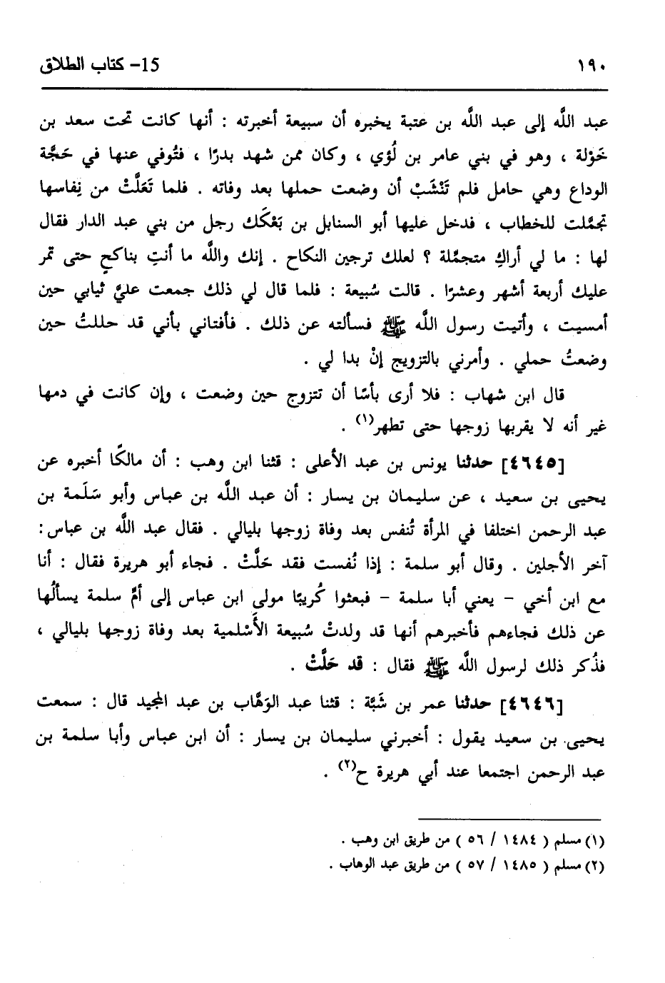4646 - حَدَّثَنَا عُمَرُ بْنُ شَبَّةَ، قثنا عَبْدُ الْوَهَّابِ بْنُ عَبْدِ الْمَجِيدِ، قَالَ: سَمِعْتُ يَحْيَى بْنَ سَعِيدٍ، يَقُولُ: أَخْبَرَنِي سُلَيْمَانُ بْنُ يَسَارٍ، أَنَّ ابْنَ عَبَّاسٍ، وَأَبَا سَلَمَةَ بْنَ عَبْدِ الرَّحْمَنِ اجْتَمَعَا عِنْدَ أَبِي هُرَيْرَةَ ح -[191]- وَحَدَّثَنَا يُونُسُ بْنُ عَبْدِ الْأَعْلَى، قثنا أَنَسُ بْنُ عِيَاضٍ، عَنْ يَحْيَى بْنِ سَعِيدٍ، عَنْ سُلَيْمَانَ بْنِ يَسَارٍ، أَنَّ عَبْدَ اللَّهِ بْنَ عَبَّاسٍ، وَأَبَا سَلَمَةَ بْنَ عَبْدِ الرَّحْمَنِ اجْتَمَعَا عِنْدَ أَبِي هُرَيْرَةَ، وَهُمَا يَذْكُرَانِ §الْمَرْأَةَ تَنْفُسُ بَعْدَ وَفَاةِ زَوْجِهَا بِلَيَالٍ، فَقَالَ ابْنُ عَبَّاسٍ: عِدَّتُهَا آخِرُ الْأَجَلَيْنِ، وَقَالَ أَبُو سَلَمَةَ: قَدْ حَلَّتْ فَجَعَلَا يَتَنَازَعَانِ ذَلِكَ، فَقَالَ أَبُو هُرَيْرَةَ: أَنَا مَعَ ابْنِ أَخِي يَعْنِي أَبَا سَلَمَةَ بْنَ عَبْدِ الرَّحْمَنِ، فَبَعَثُوا كُرَيْبًا مَوْلَى ابْنِ عَبَّاسٍ إِلَى أُمِّ سَلَمَةَ، فَسَأَلَهَا عَنْ ذَلِكَ، فَجَاءَهُمْ، فَأَخْبِرْهُمْ أَنَّ أُمَّ سَلَمَةَ قَالَتْ: إِنَّ سُبَيْعَةَ الْأَسْلَمِيَّةَ نُفِسَتْ بَعْدَ وَفَاةِ زَوْجِهَا بِلَيَالٍ، وَإِنَّهَا ذَكَرَتْ ذَلِكَ لِرَسُولِ اللَّهِ صَلَّى اللهُ عَلَيْهِ وَسَلَّمَ، فَأَمَرَهَا رَسُولُ اللَّهِ صَلَّى اللهُ عَلَيْهِ وَسَلَّمَ أَنْ تَتَزَوَّجَ "