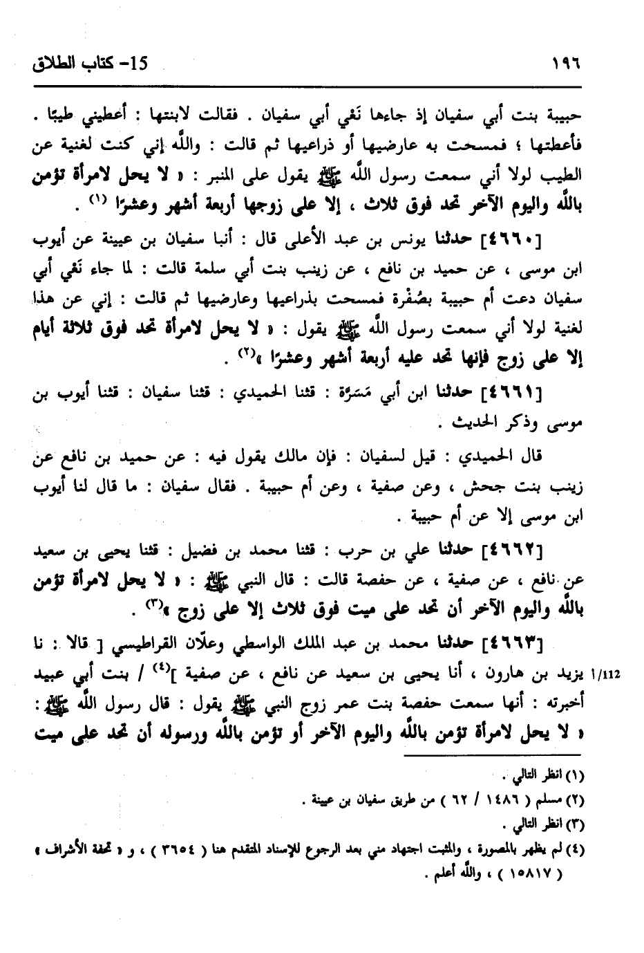 4660 - حَدَّثَنَا يُونُسُ بْنُ عَبْدِ الْأَعْلَى، قَالَ: أنبا سُفْيَانُ بْنُ عُيَيْنَةَ، عَنْ أَيُّوبَ بْنِ مُوسَى، عَنْ حُمَيْدِ بْنِ نَافِعٍ، عَنْ زَيْنَبَ بِنْتِ أَبِي سَلَمَةَ، قَالَتْ: لَمَّا جَاءَ نَعْيُ أَبِي سُفْيَانَ دَعَتْ أُمُّ حَبِيبَةَ بِصُفْرَةٍ، فَمَسَحَتْ بِذِرَاعَيْهَا وَعَارِضَيْهَا، ثُمَّ قَالَتْ: إِنِّي عَنْ هَذَا لَغَنِيَّةٌ لَوْلَا أَنِّي سَمِعْتُ رَسُولَ اللَّهِ صَلَّى اللهُ عَلَيْهِ وَسَلَّمَ يَقُولُ: «§لَا يَحِلُّ لِامْرَأَةٍ تُحِدُّ فَوْقَ ثَلَاثَةِ أَيَّامٍ إِلَّا عَلَى زَوْجٍ، فَإِنَّهَا تُحِدُّ عَلَيْهِ أَرْبَعَةَ أَشْهُرٍ وَعَشْرًا» ،