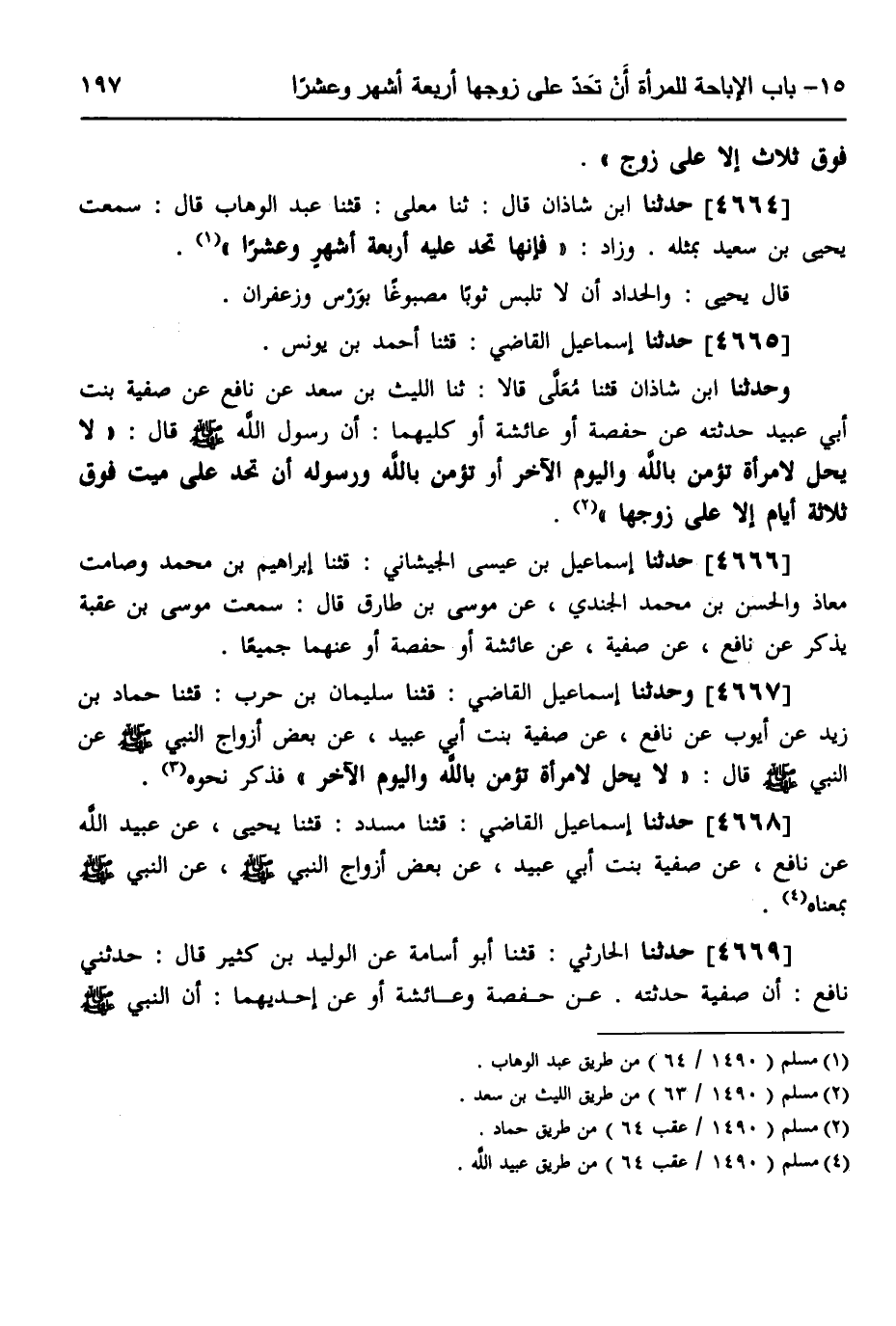 4665 - حَدَّثَنَا إِسْمَاعِيلُ الْقَاضِي، قثنا أَحْمَدُ بْنُ يُونُسَ، وَحَدَّثَنَا ابْنُ شَاذَانَ، قثنا مُعَلَّى، قَالَا: ثَنَا اللَّيْثُ بْنُ سَعْدٍ، عَنْ نَافِعٍ، عَنْ صَفِيَّةَ بِنْتِ أَبِي عُبَيْدٍ، حَدَّثَتْهُ، عَنْ حَفْصَةَ، أَوْ عَائِشَةَ أَوْ كِلَيْهِمَا أَنَّ رَسُولَ اللَّهِ صَلَّى اللهُ عَلَيْهِ وَسَلَّمَ، قَالَ: «§لَا يَحِلُّ لِامْرَأَةٍ تُؤْمِنُ بِاللَّهِ وَالْيَوْمِ الْآخِرِ أَوْ تُؤْمِنُ بِاللَّهِ وَرَسُولِهِ أَنْ تُحِدَّ عَلَى مَيِّتٍ فَوْقَ ثَلَاثَةِ أَيَّامٍ إِلَّا عَلَى زَوْجِهَا» ،