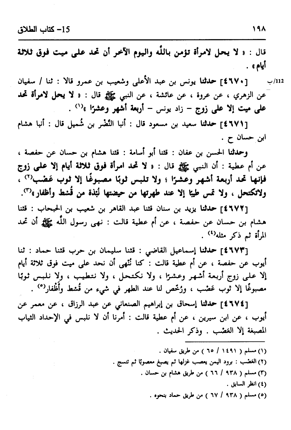 4673 - حَدَّثَنَا إِسْمَاعِيلُ الْقَاضِي، قثنا سُلَيْمَانُ بْنُ حَرْبٍ، قثنا حَمَّادٌ، ثَنَا أَيُّوبُ، عَنْ حَفْصَةَ، عَنْ أُمِّ عَطِيَّةَ، قَالَتْ: كُنَّا «§نُنْهَى أَنْ نُحِدَّ عَلَى مَيِّتٍ فَوْقَ ثَلَاثَةِ أَيَّامٍ إِلَّا عَلَى زَوْجٍ أَرْبَعَةَ أَشْهُرٍ وَعَشْرًا، وَلَا نَكْتَحِلُ، وَلَا نَتَطَيَّبُ، وَلَا نَلْبَسُ ثَوْبًا مَصْبُوغًا إِلَّا ثَوْبَ عَصْبٍ، وَرُخِّصَ لَنَا عِنْدَ الطُّهْرِ فِي شَيْءٍ مِنْ قُسْطٍ وَأَظْفَارٍ»