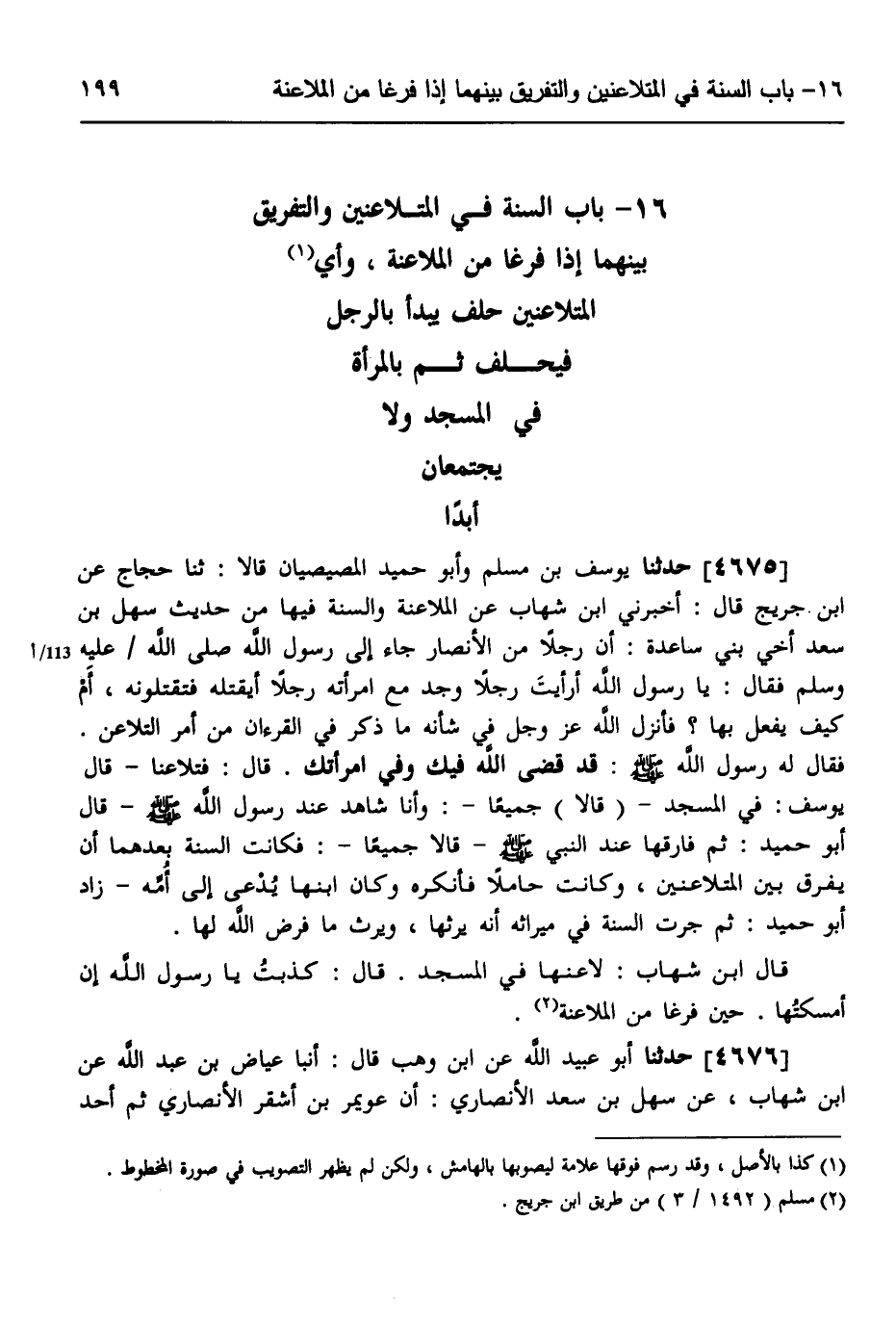 4675 - حَدَّثَنَا يُوسُفُ بْنُ مُسْلِمٍ، وَأَبُو حُمَيْدٍ الْمِصِّيصِيَّانُ، قَالَا: ثَنَا حَجَّاجٌ، عَنِ ابْنِ جُرَيْجٍ، قَالَ: أَخْبَرَنِي ابْنُ شِهَابٍ، عَنِ الْمُلَاعَنَةِ وَالسُّنَّةِ فِيهَا مِنْ حَدِيثِ سَهْلِ بْنِ سَعْدٍ أَخِي بَنِي سَاعِدَةَ أَنَّ رَجُلٌا مِنَ الْأَنْصَارِ جَاءَ إِلَى رَسُولِ اللَّهِ صَلَّى اللهُ عَلَيْهِ وَسَلَّمَ، فَقَالَ: يَا رَسُولَ اللَّهِ، أَرَأَيْتَ رَجُلًا وَجَدَ مَعَ امْرَأَتِهِ رَجُلًا أَيَقْتُلُهُ فَتَقْتُلُونَهُ أَمْ كَيْفَ يَفْعَلُ بِهَا؟ فَأَنْزَلَ اللَّهُ عَزَّ وَجَلَّ فِي شَأْنِهِ مَا ذُكِرَ فِي الْقُرْآنِ مِنْ أَمْرِ التَّلَاعُنِ، فَقَالَ لَهُ رَسُولُ اللَّهِ صَلَّى اللهُ عَلَيْهِ وَسَلَّمَ: «§قَدْ قَضَى اللَّهُ فِيكَ وَفِي امْرَأَتِكَ» قَالَ: فَتَلَاعَنَا، قَالَ يُوسُفُ: فِي الْمَسْجِدِ قَالَا جَمِيعًا: وَأَنَا شَاهِدٌ عِنْدَ رَسُولِ اللَّهِ صَلَّى اللهُ عَلَيْهِ وَسَلَّمَ، قَالَ أَبُو حُمَيْدٍ: ثُمَّ فَارَقَهَا عِنْدَ النَّبِيِّ صَلَّى اللهُ عَلَيْهِ وَسَلَّمَ قَالَا جَمِيعًا: فَكَانَتِ السُّنَّةُ بَعْدَهُمَا أَنْ يُفَرَّقَ بَيْنَ الْمُتَلَاعِنَيْنِ، وَكَانَتْ حَامِلًا فَأَنْكَرَهُ وَكَانَ ابْنُهَا يُدْعَى إِلَى أُمِّهِ زَادَ أَبُو حُمَيْدٍ، ثُمَّ جَرَتِ السُّنَّةُ فِي مِيرَاثِهِ أَنَّهُ يَرِثُهَا وَيَرِثُ مَا فَرَضَ اللَّهُ لَهَا قَالَ ابْنُ شِهَابٍ: لَاعَنَهَا فِي الْمَسْجِدِ قَالَ: كَذَبْتُ يَا رَسُولَ اللَّهِ، إِنْ أَمْسَكْتُهَا حِينَ فَرَغَا مِنَ الْمُلَاعَنَةِ "