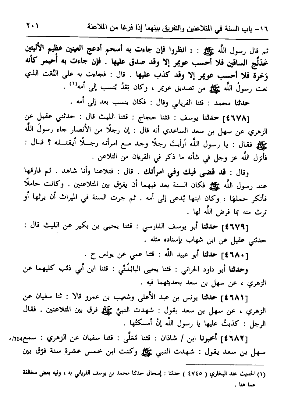 4678 - حَدَّثَنَا يُوسُفُ، قثنا حَجَّاجٌ، قثنا اللَّيْثُ، قَالَ: حَدَّثَنِي عَقِيلٌ، عَنِ الزُّهْرِيِّ، عَنْ سَهْلِ بْنِ سَعْدٍ السَّاعِدِيِّ، أَنَّهُ قَالَ: إِنَّ رَجُلًا مِنَ الْأَنْصَارِ جَاءَ رَسُولَ اللَّهِ صَلَّى اللهُ عَلَيْهِ وَسَلَّمَ فَقَالَ: يَا رَسُولَ اللَّهِ، §أَرَأَيْتَ رَجُلًا وَجَدَ مَعَ امْرَأَتِهِ رَجُلًا أَيَقْتُلُهُ؟ قَالَ فَأَنْزَلَ اللَّهُ عَزَّ وَجَلَّ فِي شَأْنِهِ مَا ذُكِرَ فِي الْقُرْآنِ مِنَ التَّلَاعُنِ وَقَالَ: «قَدْ قَضَى فِيكَ وَفِي امْرَأَتِكَ» ، قَالَ: فَتَلَاعَنَا وَأَنَا شَاهِدٌ، ثُمَّ فَارَقَهَا عِنْدَ رَسُولِ اللَّهِ صَلَّى اللهُ عَلَيْهِ وَسَلَّمَ، فَكَانَ السُّنَّةُ بَعْدُ فِيهِمَا أَنْ يُفَرَّقَ بَيْنَ الْمُتَلَاعِنَيْنِ، وَكَانَتْ حَامِلًا، فَأَنْكَرَ حَمْلَهَا وَكَانَ ابْنُهَا يُدْعَى إِلَى أُمِّهِ، ثُمَّ جَرَتِ السُّنَّةُ فِي الْمِيرَاثِ أَنْ يَرِثَهَا، أَوْ تَرِثَ مِنْهُ بِمَا فَرَضَ اللَّهِ لَهَا "،