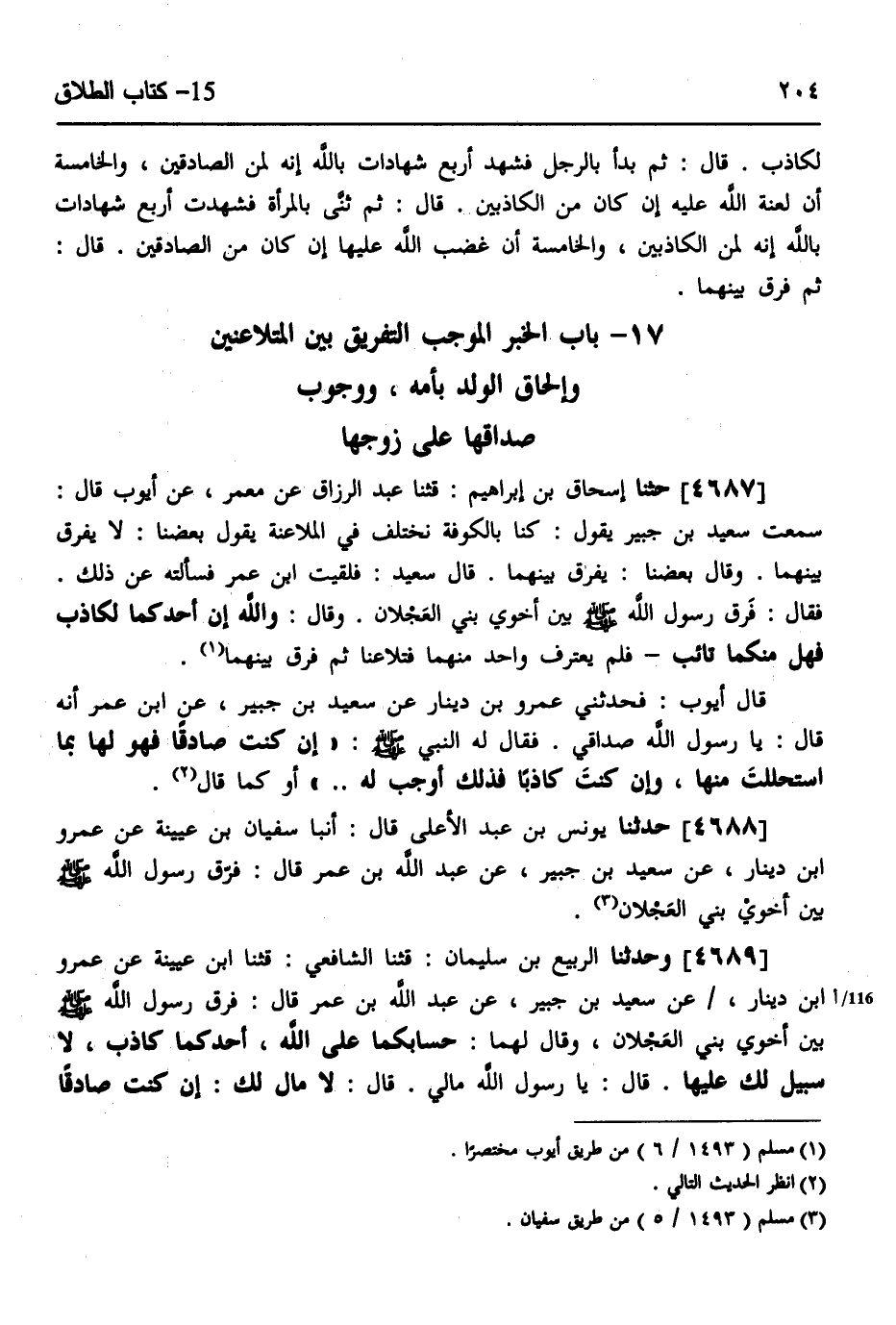 4687 - حثنا إِسْحَاقُ بْنُ إِبْرَاهِيمَ، قثنا عَبْدُ الرَّزَّاقِ، عَنْ مَعْمَرٍ، عَنْ أَيُّوبَ، قَالَ: سَمِعْتُ سَعِيدَ بْنَ جُبَيْرٍ، يَقُولُ: كُنَّا بِالْكُوفَةِ نَخْتَلِفُ فِي الْمُلَاعَنَةِ يَقُولُ بَعْضُنَا: لَا يُفَرَّقُ بَيْنَهُمَا، وَقَالَ بَعْضُنَا: يُفَرَّقُ بَيْنَهُمَا قَالَ سَعِيدٌ: فَلَقِيتُ ابْنَ عُمَرَ، فَسَأَلْتُهُ عَنْ ذَلِكَ، فَقَالَ: §فَرَّقَ رَسُولُ اللَّهِ صَلَّى اللهُ عَلَيْهِ وَسَلَّمَ بَيْنَ أَخَوَي بَنِي الْعَجْلَانِ، وَقَالَ: " وَاللَّهِ إِنَّ أَحَدَكُمَا لَكَاذِبٌ فَهَلْ مِنْكُمَا تَائِبٌ؟ فَلَمْ يَعْتَرِفْ وَاحِدٌ مِنْهُمَا فَتَلَاعَنَا، ثُمَّ فَرَّقَ بَيْنَهُمَا، قَالَ أَيُّوبُ: فَحَدَّثَنِي عَمْرُو بْنُ دِينَارٍ، عَنْ سَعِيدِ بْنِ جُبَيْرٍ، عَنِ ابْنِ عُمَرَ أَنَّهُ قَالَ: يَا رَسُولَ اللَّهِ، صَدَاقِي، فَقَالَ لَهُ النَّبِيُّ صَلَّى اللهُ عَلَيْهِ وَسَلَّمَ: «إِنْ كُنْتَ صَادِقًا فَهُوَ لَهَا بِمَا اسْتَحْلَلْتَ مِنْهَا وَإِنْ كُنْتَ كَاذِبًا فَذَلِكَ أَوْجَبُ لَهُ» أَوْ كَمَا قَالَ "
