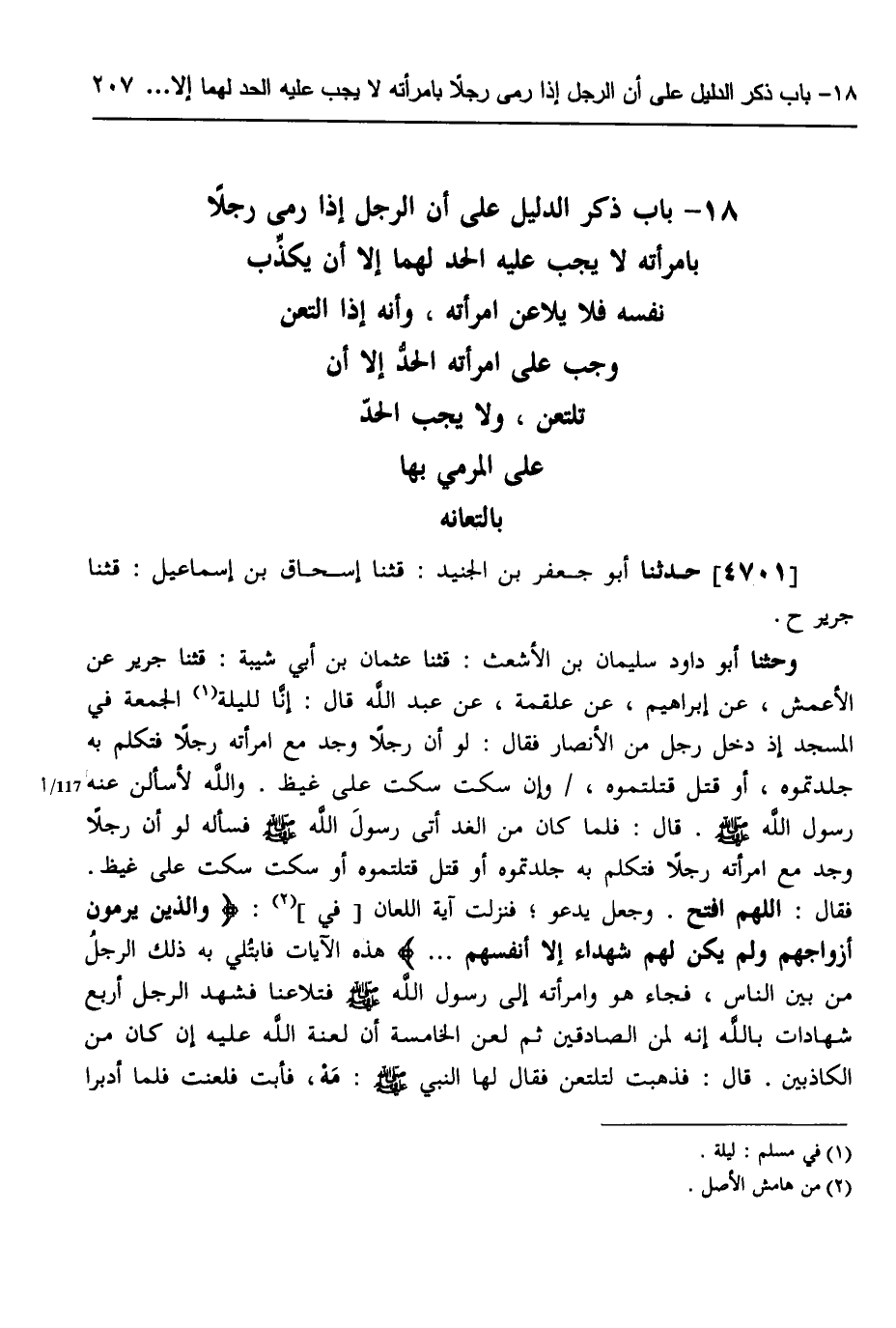 4701 - حَدَّثَنَا أَبُو جَعْفَرِ بْنُ الْجُنَيْدِ، قثنا إِسْحَاقُ بْنُ إِسْمَاعِيلَ، قثنا جَرِيرٌ، ح وحثنا أَبُو دَاوُدَ سُلَيْمَانُ بْنُ الْأَشْعَثِ، قثنا عُثْمَانُ بْنُ أَبِي شَيْبَةَ، قثنا جَرِيرٌ، عَنِ الْأَعْمَشِ، عَنْ إِبْرَاهِيمَ، عَنْ عَلْقَمَةَ، عَنْ عَبْدِ اللَّهِ، قَالَ: إِنَّا §لَلَيْلَةَ الْجُمُعَةِ فِي الْمَسْجِدِ إِذْ دَخَلَ رَجُلٌ مِنَ الْأَنْصَارِ، فَقَالَ: لَو أَنَّ رَجُلًا وَجَدَ مَعَ امْرَأَتِهِ رَجُلًا، فَتَكَلَّمَ بِهِ جَلَدْتُمُوهُ أَوْ قَتَلَ قَتَلْتُمُوهُ، وَإِنْ سَكَتَ سَكَتَ عَلَى غَيْظٍ، وَاللَّهِ لَأَسْأَلَنَّ عَنْهُ رَسُولَ اللَّهِ صَلَّى اللهُ عَلَيْهِ وَسَلَّمَ قَالَ: فَلَمَّا كَانَ مِنَ الْغَدِ أَتَى رَسُولَ اللَّهِ صَلَّى اللهُ عَلَيْهِ وَسَلَّمَ، فَسَأَلَهُ لَوْ أَنَّ رَجُلًا وَجَدَ مَعَ امْرَأَتِهِ رَجُلًا، فَتَكَلَّمَ بِهِ جَلَدْتُمُوهُ أَوْ قَتَلَ قَتَلْتُمُوهُ أَوْ سَكَتَ سَكَتَ عَلَى غَيْظٍ، فَقَالَ: " اللَّهُمَّ افْتَحْ وَجَعَلَ يَدْعُو فَنَزَلَتْ آيَةُ اللِّعَانِ فِي {وَالَّذِينَ يَرْمُونَ أَزْوَاجَهُمْ وَلَمْ يَكُنْ لَهُمْ شُهَدَاءُ إِلَّا أَنْفُسَهُمْ} [النور: 6] هَذِهِ الْآيَاتُ فَابْتُلِيَ بِهِ ذَلِكَ الرَّجُلُ مِنْ بَيْنِ النَّاسِ، فَجَاءَ هُوَ وَامْرَأَتُهُ إِلَى رَسُولِ اللَّهِ صَلَّى اللهُ عَلَيْهِ وَسَلَّمَ فَتَلَاعَنَا، فَشَهِدَ الرَّجُلُ أَرْبَعَ شَهَادَاتٍ بِاللَّهِ إِنَّهُ لِمَنِ الصَّادِقِينَ، ثُمَّ لَعَنَ الْخَامِسَةَ أَنَّ لَعْنَةَ اللَّهِ عَلَيْهِ إِنْ كَانَ مِنَ الْكَاذِبِينَ، قَالَ: فَذَهَبَتْ لِتَلْتَعِنَ، فَقَالَ لَهَا النَّبِيُّ صَلَّى اللهُ عَلَيْهِ وَسَلَّمَ: «مَهْ» ، فَأَبَتْ فَلَعَنَتْ، فَلَمَّا أَدْبَرَا -[208]- قَالَ: «لَعَلَّهَا أَنْ تَجِيءَ بِهِ أَسْوَدَ جَعْدًا» ، فَجَاءَتْ بِهِ أَسْوَدَ جَعْدًا "