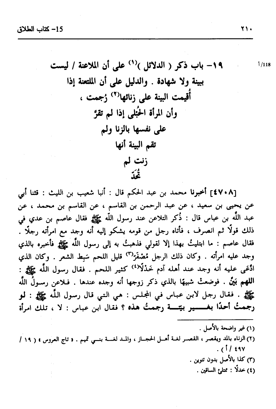 4708 - أَخْبَرَنَا مُحَمَّدُ بْنُ عَبْدِ الْحَكَمِ، قَالَ: أنبا شُعَيْبُ بْنُ اللَّيْثِ، قثنا أَبِي، عَنْ يَحْيَى بْنِ سَعِيدٍ، عَنْ عَبْدِ الرَّحْمَنِ بْنِ الْقَاسِمِ، عَنِ الْقَاسِمِ بْنِ مُحَمَّدٍ، عَنْ عَبْدِ اللَّهِ بْنِ عَبَّاسٍ، قَالَ: ذُكِرَ التَّلَاعُنُ عِنْدَ رَسُولِ اللَّهِ صَلَّى اللهُ عَلَيْهِ وَسَلَّمَ، فَقَالَ عَاصِمُ بْنُ عَدِيٍّ فِي ذَلِكَ قَوْلًا، ثُمَّ انْصَرَفَ، فَأَتَاهُ رَجُلٌ مِنْ قَوْمِهِ يَشْكُو إِلَيْهِ أَنَّهُ وَجَدَ مَعَ امْرَأَتِهِ رَجُلًا، فَقَالَ عَاصِمٌ: مَا ابْتُلِيتُ بِهَذَا إِلَّا لِقَوْلِي، فَذَهَبْتُ بِهِ إِلَى رَسُولِ اللَّهِ صَلَّى اللهُ عَلَيْهِ وَسَلَّمَ، فَأَخْبَرَهُ بِالَّذِي وَجَدَ عَلَيْهِ امْرَأَتَهُ وَكَانَ ذَلِكَ الرَّجُلُ مُصْفَرًّا قَلِيلَ اللَّحْمِ سَبِطَ الشَّعْرِ، وَكَانَ الَّذِي ادَّعَى عَلَيْهِ أَنَّهُ وَجَدَ عِنْدَ أَهْلِهِ آدَمَ خَدْلًا كَثِيرَ اللَّحْمِ، فَقَالَ رَسُولُ اللَّهِ صَلَّى اللهُ عَلَيْهِ وَسَلَّمَ: «اللَّهُمَّ بَيِّنْ» ، فَوَضَعَتْ شَبِيهًا بِالَّذِي ذَكَرَ زَوْجُهَا أَنَّهُ وَجَدَهُ عِنْدَهَا، فَلَاعَنَ رَسُولُ اللَّهِ صَلَّى اللهُ عَلَيْهِ وَسَلَّمَ، فَقَالَ رَجُلٌ لِابْنِ عَبَّاسٍ فِي الْمَجْلِسِ: هِيَ الَّتِي قَالَ رَسُولُ اللَّهِ صَلَّى اللهُ عَلَيْهِ وَسَلَّمَ: «§لَو رَجَمْتُ أَحَدًا بِغَيْرِ بَيِّنَةٍ رَجَمْتُ هَذِهِ؟» ، فَقَالَ ابْنُ عَبَّاسٍ: لَا تِلْكَ امْرَأَةٌ -[211]- كَانَتْ تُظْهِرُ فِي الْإِسْلَامِ السُّوءَ "،