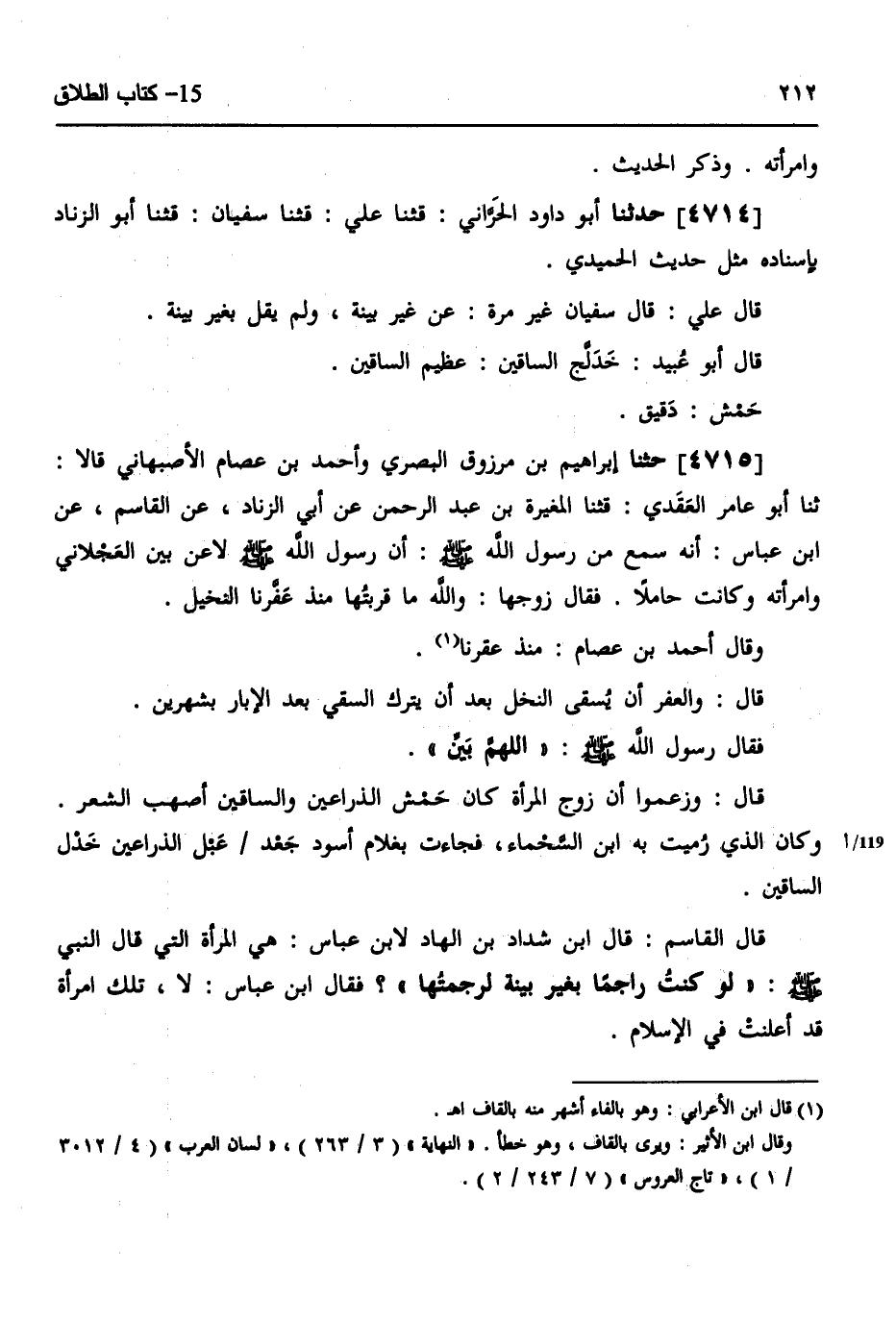 4715 - حثنا إِبْرَاهِيمُ بْنُ مَرْزُوقٍ الْبَصْرِيُّ، وَأَحْمَدُ بْنُ عِصَامٍ الْأَصْبَهَانِيُّ قَالَا: ثَنَا أَبُو عَامِرٍ الْعَقَدِيُّ، قثنا الْمُغِيرَةُ بْنُ عَبْدِ الرَّحْمَنِ، عَنْ أَبِي الزِّنَادِ، عَنِ الْقَاسِمِ، عَنِ ابْنِ عَبَّاسٍ، أَنَّهُ سَمِعَ مِنْ رَسُولِ اللَّهِ صَلَّى اللهُ عَلَيْهِ وَسَلَّمَ أَنَّ رَسُولَ اللَّهِ صَلَّى اللهُ عَلَيْهِ وَسَلَّمَ لَاعَنَ بَيْنَ الْعَجْلَانِيِّ وَامْرَأَتِهِ وَكَانَتْ حَامِلًا، فَقَالَ زَوْجُهَا: وَاللَّهِ مَا قَرَبْتُهَا مُنْذُ عَفَرْنَا النَّخِيلَ، وَقَالَ أَحْمَدُ بْنُ عِصَامٍ: مُنْذُ عَقَرْنَا قَالَ: وَالْعَفْرُ أَنْ يُسْقَى النَّخْلُ بَعْدَ أَنْ يَتْرُكَ السَّقْيُ بَعْدَ الْإِبَارِ بِشَهْرَيْنِ، فَقَالَ رَسُولُ اللَّهِ صَلَّى اللهُ عَلَيْهِ وَسَلَّمَ: «اللَّهُمَّ بَيِّنْ» قَالَ: وَزَعَمُوا أَنَّ زَوْجَ الْمَرْأَةِ كَانَ حَمْشَ الذِّرَاعَيْنِ وَالسَّاقَيْنِ أَصْهَبَ الشَّعْرِ، وَكَانَ الَّذِي رُمِيَتْ بِهِ ابْنَ السَّحْمَاءِ فَجَاءَتْ بِغُلَامٍ أَسْوَدَ جَعْدًا عَبْلَ الذِّرَاعَيْنِ خَدْلَ السَّاقَيْنِ، قَالَ الْقَاسِمُ: قَالَ ابْنُ شَدَّادِ بْنِ الْهَادِ لِابْنِ عَبَّاسٍ: هِيَ الْمَرْأَةُ الَّتِي قَالَ النَّبِيُّ صَلَّى اللهُ عَلَيْهِ وَسَلَّمَ: «§لَوْ كُنْتُ رَاجِمًا بِغَيْرِ بَيِّنَةٍ لَرَجَمْتُهَا؟» فَقَالَ ابْنُ عَبَّاسٍ: لَا تِلْكَ امْرَأَةٌ قَدْ أَعْلَنَتْ فِي الْإِسْلَامِ "