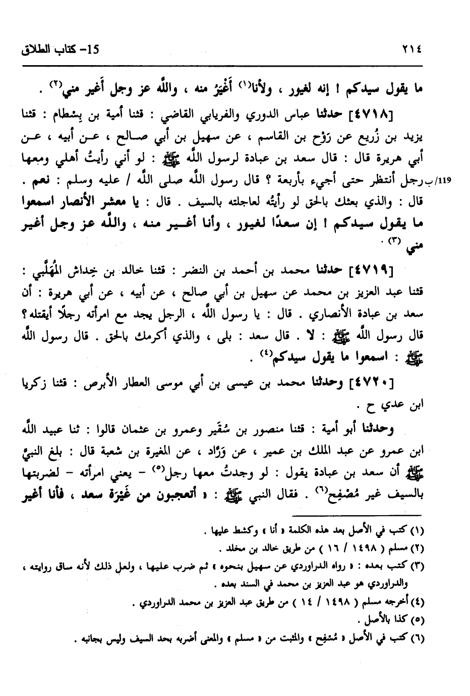 4718 - حَدَّثَنَا عَبَّاسٌ الدُّورِيُّ، وَالْفِرْيَابِيُّ الْقَاضِي، قثنا أُمَيَّةِ بْنُ بِسْطَامٍ، قثنا يَزِيدُ بْنُ زُرَيْعٍ، عَنْ رَوْحِ بْنِ الْقَاسِمِ، عَنْ سُهَيْلِ بْنِ أَبِي صَالِحٍ، عَنْ أَبِيهِ، عَنْ أَبِي هُرَيْرَةَ، قَالَ: قَالَ سَعْدُ بْنُ عُبَادَةَ لِرَسُولِ اللَّهِ صَلَّى اللهُ عَلَيْهِ وَسَلَّمَ: لَوْ أَنِّي رَأَيْتُ أَهْلِي وَمَعَهَا رَجُلٌ أَنْتَظِرُ حَتَّى أَجِيءَ بِأَرْبَعَةٍ؟ قَالَ رَسُولُ اللَّهِ صَلَّى اللهُ عَلَيْهِ وَسَلَّمَ: «نَعَمْ» ، قَالَ: وَالَّذِي بَعَثَكَ بِالْحَقِّ لَوْ رَأَيْتُهُ لَعَاجَلْتُهُ بِالسَّيْفِ، قَالَ: «§يَا مَعْشَرَ الْأَنْصَارِ اسْمَعُوا مَا يَقُولُ سَيِّدُكُمْ إِنَّ سَعْدًا لَغَيُورٌ وَأَنَا أَغْيَرُ مِنْهُ وَاللَّهُ عَزَّ وَجَلَّ أَغْيَرُ مِنِّي»
