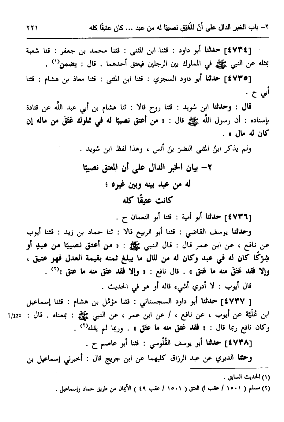 4736 - حَدَّثَنَا أَبُو أُمَيَّةَ، قثنا أَبُو النُّعْمَانِ، ح وَحَدَّثَنَا يُوسُفُ الْقَاضِي، قثنا أَبُو الرَّبِيعِ، قَالَا: ثَنَا حَمَّادُ بْنُ زَيْدٍ، قثنا أَيُّوبُ، عَنْ نَافِعٍ، عَنِ ابْنِ عُمَرَ، قَالَ: قَالَ النَّبِيُّ صَلَّى اللهُ عَلَيْهِ وَسَلَّمَ: «§مَنْ أَعْتَقَ نَصِيبًا مِنْ عَبْدٍ أَوْ شِرْكًا، كَانَ لَهُ فِي عَبْدٍ، وَكَانَ لَهُ مِنَ الْمَالِ مَا يَبْلُغُ ثَمَنَهُ بِقِيمَةِ الْعَدْلِ، فَهُوَ عَتِيقٌ، وَإِلَّا فَقَدْ عَتَقَ مِنْهُ مَا عَتَقَ» ، قَالَ نَافِعٌ: «وَإِلَّا فَقَدْ عَتَقَ مِنْهُ مَا عَتَقَ» ، قَالَ أَيُّوبُ: لَا أَدْرِي أَشَيْءٌ قَالَهُ أَوْ هُوَ فِي الْحَدِيثِ؟،