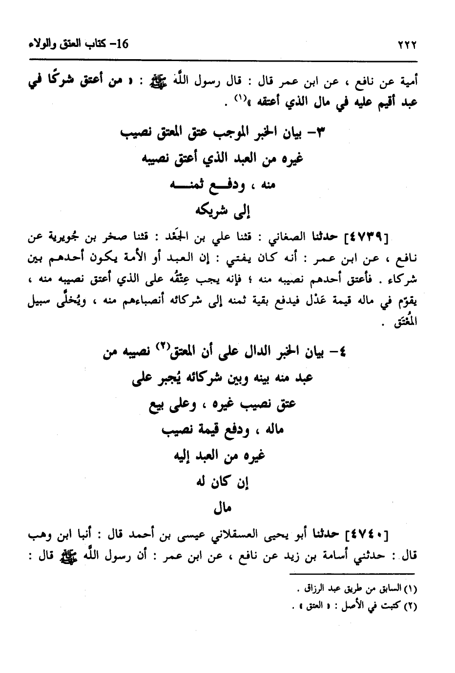 4739 - حَدَّثَنَا الصَّغَانِيُّ، قثنا عَلِيُّ بْنُ الْجَعْدِ، قثنا صَخْرُ بْنُ جُوَيْرِيَةَ، عَنْ نَافِعٍ، عَنِ ابْنِ عُمَرَ، أَنَّهُ كَانَ «§يُفْتِي أَنَّ الْعَبْدَ، أَوِ الْأَمَةَ يَكُونُ أَحَدُهُمْ بَيْنَ شُرَكَاءَ، فَأَعْتَقَ أَحَدُهُمْ نَصِيبَهُ مِنْهُ، فَإِنَّهُ يَجِبُ عِتْقُهُ عَلَى الَّذِي أَعْتَقَ نَصِيبَهُ مِنْهُ يُقَوَّمُ فِي مَالِهِ قِيمَةَ عَدْلٍ، فَيَدْفَعُ بَقِيَّةَ ثَمَنِهِ إِلَى شُرَكَائِهِ أَنْصَبَاءَهُمْ مِنْهُ، وَيُخَلَّى سَبِيلَ الْمُعْتَقِ»
