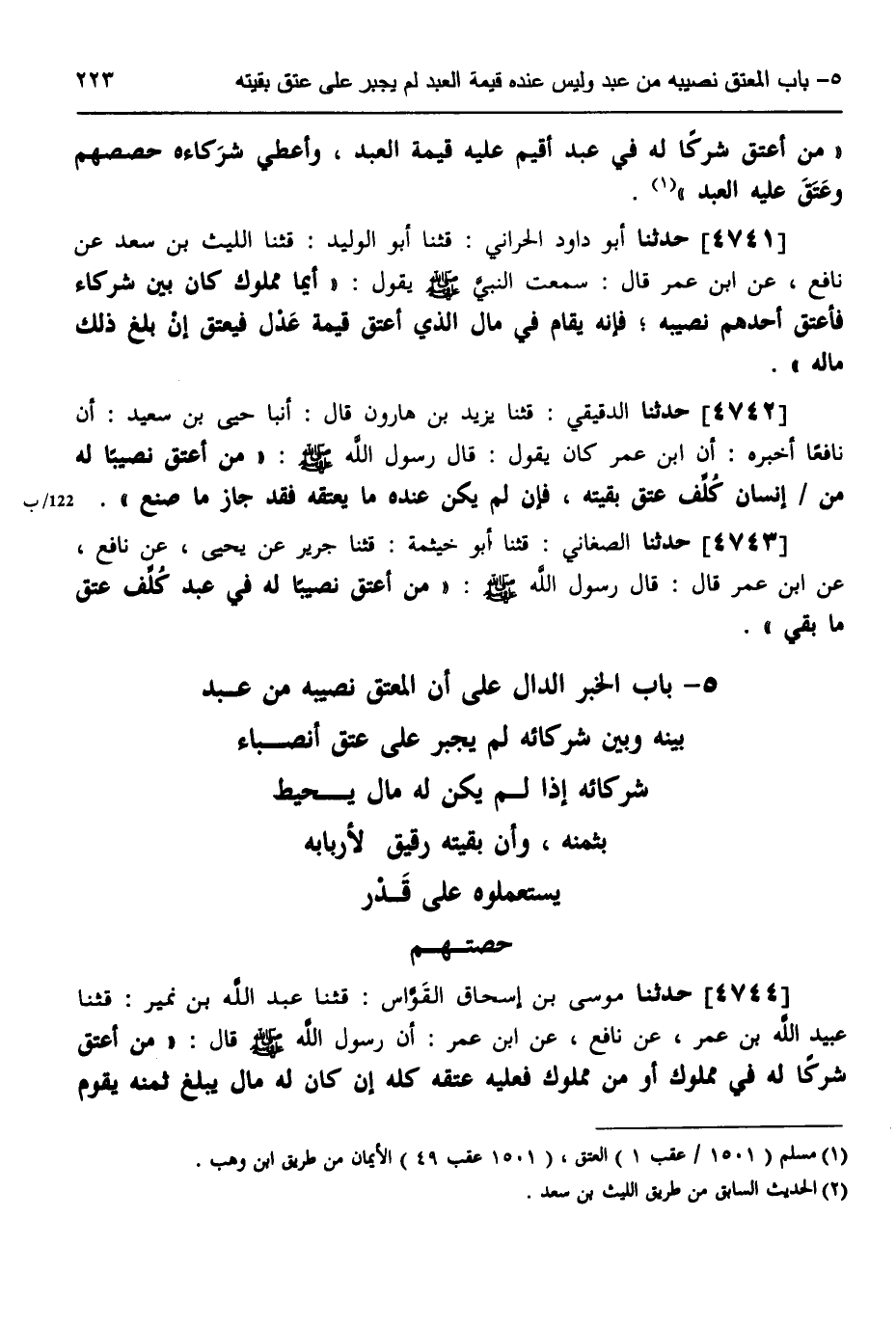 4741 - حَدَّثَنَا أَبُو دَاوُدَ الْحَرَّانِيُّ، قثنا أَبُو الْوَلِيدِ، قثنا اللَّيْثُ بْنُ سَعْدٍ، عَنْ نَافِعٍ، عَنِ ابْنِ عُمَرَ، قَالَ: سَمِعْتُ النَّبِيَّ صَلَّى اللهُ عَلَيْهِ وَسَلَّمَ يَقُولُ: «§أَيُّمَا مَمْلُوكٍ كَانَ بَيْنَ شُرَكَاءَ، فَأَعْتَقَ أَحَدُهُمْ نَصِيبَهُ، فَإِنَّهُ يُقَامُ فِي مَالِ الَّذِي أَعْتَقَ قِيمَةَ عَدْلٍ، فَيُعْتَقُ إِنْ بَلَغَ ذَلِكَ مَالُهُ»