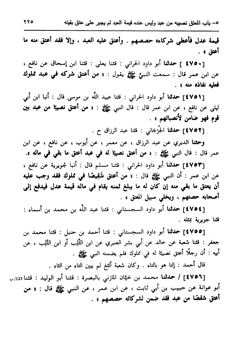 4753 - حَدَّثَنَا أَبُو دَاوُدَ الْحَرَّانِيُّ، قثنا مُسْلِمٌ، قَالَ: أنبا جُوَيْرِيَةُ، عَنْ نَافِعٍ، عَنِ ابْنِ عُمَرَ، أَنَّ النَّبِيَّ صَلَّى اللهُ عَلَيْهِ وَسَلَّمَ قَالَ: «§مَنْ أَعْتَقَ شَقِيصًا فِي مَمْلُوكٍ، فَقَدْ وَجَبَ عَلَيْهِ أَنْ يُعْتِقَ مَا بَقِيَ مِنْهُ إِنْ كَانَ لَهُ مَا يَبْلُغُ ثَمَنَهُ يُقَامُ فِي مَالِهِ قِيمَةَ عَدْلٍ، فَيَدْفَعُ إِلَى أَصْحَابِهِ حِصَّتَهُمْ وَيُخَلَّى سَبِيلَ الْمُعْتَقِ» ،