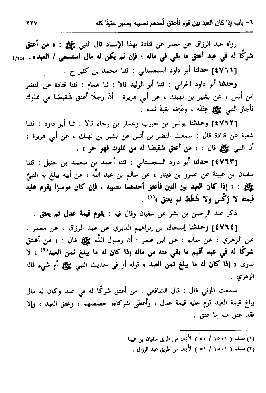 4763 - حَدَّثَنَا أَبُو دَاوُدَ السِّجِسْتَانِيُّ، قثنا أَحْمَدُ بْنُ مُحَمَّدِ بْنِ حَنْبَلٍ، قثنا سُفْيَانُ بْنُ عُيَيْنَةَ، عَنْ عَمْرِو بْنِ دِينَارٍ، عَنْ سَالِمِ بْنِ عَبْدِ اللَّهِ، عَنْ أَبِيهِ، يَبْلُغُ بِهِ النَّبِيَّ صَلَّى اللهُ عَلَيْهِ وَسَلَّمَ «§إِذَا كَانَ الْعَبْدُ بَيْنَ اثْنَيْنِ، فَأَعْتَقَ أَحَدُهُمَا نَصِيبَهُ، فَإِنْ كَانَ مُوِسَرًا يُقَوَّمُ عَلَيْهِ قِيمَتَهُ لَا وَكْسَ، وَلَا شَطَطَ، ثُمَّ يُعْتِقُ» ذِكْرُ عَبْدِ الرَّحْمَنِ بْنِ بِشْرٍ، عَنْ سُفْيَانَ، وَقَالَ فِيهِ: «يُقَوَّمُ قِيمَةَ عَدْلٍ، ثُمَّ يُعْتِقُ»