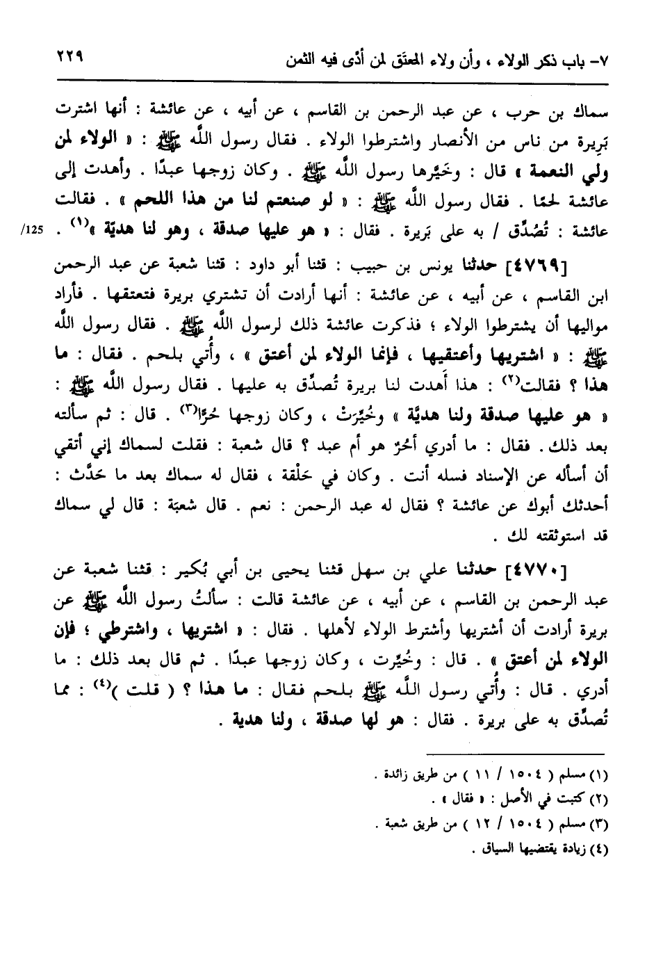 4770 - حَدَّثَنَا عَلِيُّ بْنُ سَهْلٍ، قثنا يَحْيَى بْنُ أَبِي بُكَيْرٍ، قثنا شُعْبَةُ، عَنْ عَبْدِ الرَّحْمَنِ بْنِ الْقَاسِمِ، عَنْ أَبِيهِ، عَنْ عَائِشَةَ، قَالَتْ: سَأَلْتُ رَسُولَ اللَّهِ صَلَّى اللهُ عَلَيْهِ وَسَلَّمَ عَنْ بَرِيرَةَ أَرَادَتْ أَنْ أَشْتَرِيَهَا وَأَشْتَرِطُ الْوَلَاءَ لِأَهْلِهَا، فَقَالَ: «اشْتَرِيهَا وَاشْتَرِطِي §فَإِنَّ الْوَلَاءَ لِمَنْ أَعْتَقَ» ، قَالَ: وَخُيِّرَتْ وَكَانَ زَوْجُهَا عَبْدًا، ثُمَّ قَالَ بَعْدَ ذَلِكَ: مَا أَدْرِي قَالَ: وَأُتِيَ رَسُولُ اللَّهِ صَلَّى اللهُ عَلَيْهِ وَسَلَّمَ بِلَحْمٍ، فَقَالَ: «مَا هَذَا؟» ، قُلْتُ: مِمَّا تُصِدِّقَ بِهِ عَلَى بَرِيرَةَ فَقَالَ: «هُوَ لَهَا صَدَقَةٌ وَلَنَا هَدِيَّةٌ»