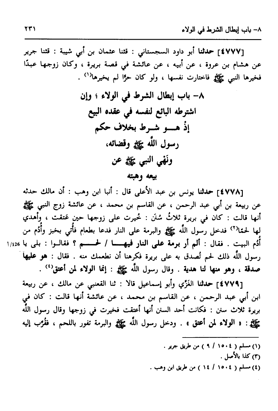 4779 - حَدَّثَنَا الْغَزِّيُّ، وَأَبُو إِسْمَاعِيلَ، قَالَا: ثَنَا الْقَعْنَبِيُّ، عَنْ مَالِكٍ، عَنْ رَبِيعَةَ بْنِ أَبِي عَبْدِ الرَّحْمَنِ، عَنِ الْقَاسِمِ بْنِ مُحَمَّدٍ، عَنْ عَائِشَةَ، أَنَّهَا قَالَتْ: كَانَ فِي بَرِيرَةَ ثَلَاثُ سُنَنٍ فَكَانَتْ أَحَدُ السُّنَنِ أَنَّهَا أُعْتِقَتْ، فَخُيِّرَتْ فِي زَوْجِهَا، وَقَالَ رَسُولُ اللَّهِ صَلَّى اللهُ عَلَيْهِ وَسَلَّمَ: «§الْوَلَاءُ لِمَنْ أَعْتَقَ» وَدَخَلَ رَسُولُ اللَّهِ صَلَّى اللهُ عَلَيْهِ وَسَلَّمَ وَالْبُرْمَةُ تَفُورُ بِاللَّحْمِ، فَقُرِّبَ إِلَيْهِ -[232]- خُبْزٌ، وَأُدْمٌ مِنْ أُدْمِ الْبَيْتِ، فَقَالَ رَسُولُ اللَّهِ صَلَّى اللهُ عَلَيْهِ وَسَلَّمَ: «أَلَمْ أَرَ بُرْمَةً فِيهَا لَحْمٌ؟» ، فَقَالُوا: بَلَى يَا رَسُولَ اللَّهِ، وَذَلِكَ لَحْمٌ تُصُدِّقَ بِهِ عَلَى بَرِيرَةَ، وَأَنْتَ لَا تَأْكُلُ الصَّدَقَةَ، فَقَالَ رَسُولُ اللَّهِ صَلَّى اللهُ عَلَيْهِ وَسَلَّمَ: «هُوَ عَلَيْهَا صَدَقَةٌ وَهُوَ لَنَا هَدِيَّةٌ»