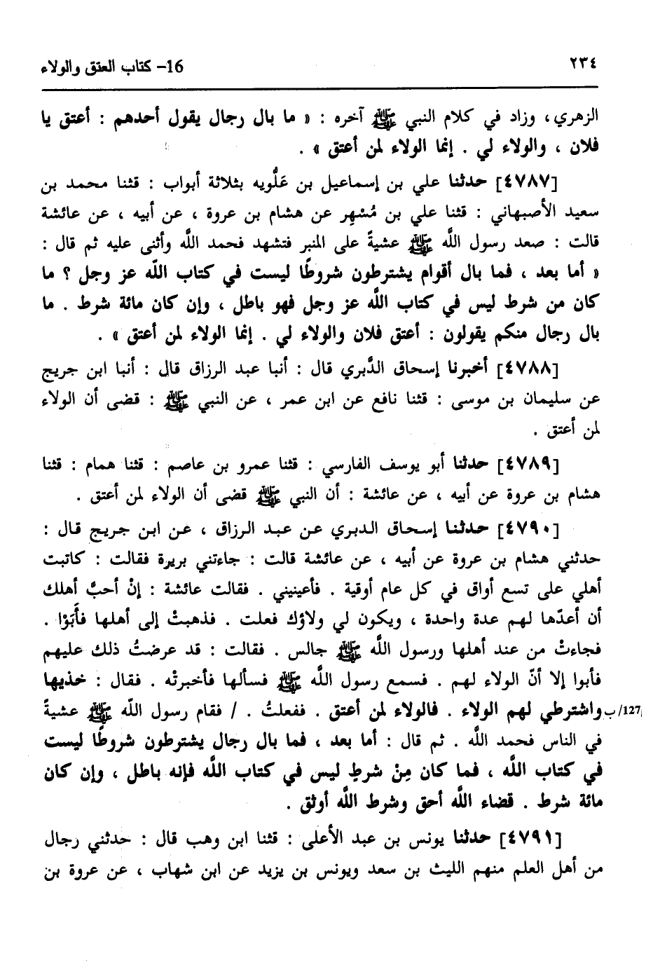 4791 - حَدَّثَنَا يُونُسُ بْنُ عَبْدِ الْأَعْلَىِ، قثنا ابْنُ وَهْبٍ، قَالَ: حَدَّثَنِي رِجَالٌ، مِنْ أَهْلِ الْعِلْمِ مِنْهُمُ اللَّيْثُ بْنُ سَعْدٍ، وَيُونُسُ بْنُ يَزِيدَ، عَنِ ابْنِ شِهَابٍ، عَنْ عُرْوَةَ بْنِ -[235]- الزُّبَيْرِ، عَنْ عَائِشَةَ، زَوْجِ النَّبِيِّ صَلَّى اللهُ عَلَيْهِ وَسَلَّمَ أَنَّهَا قَالَتْ: جَاءَتْ بَرِيرَةُ إِلَى بَيْتِي، فَقَالَتْ: يَا عَائِشَةُ، إِنِّي كَاتَبْتُ أَهْلِي عَلَى تِسْعِ أَوَاقٍ فِي كُلِّ عَامٍ أُوقِيَّةٌ فَأَعِينِينِي، وَلَمْ تَكُنْ قَضَتْ مِنْ كِتَابَتِهَا شَيْئًا، فَقَالَتْ لَهَا عَائِشَةُ: ارْجِعِي إِلَى أَهْلِكِ، فَإِنْ أَحَبُّوا أَنْ أُعْطِيَهُمْ ذَلِكَ جَمِيعًا وَيَكُونَ وَلَاؤُكِ لِي فَعَلْتُ فَذَهَبَتْ بَرِيرَةُ إِلَى أَهْلِهَا، فَعَرَضَتْ ذَلِكَ عَلَيْهِمْ: فَأَبَوْا وَقَالُوا: إِنْ شَاءَتْ أَنْ تَحْتَسِبَ عَلَيْكِ، فَلْتَفْعَلْ وَيَكُونُ وَلَاؤُكِ لَنَا، فَذَكَرَتْ ذَلِكَ عَائِشَةُ لِرَسُولِ اللَّهِ صَلَّى اللهُ عَلَيْهِ وَسَلَّمَ، فَقَالَ: «لَا يَمْنَعُكِ ذَلِكَ مِنْهَا ابْتَاعِي وَأَعْتِقِي، فَإِنَّمَا الْوَلَاءُ لِمَنْ أَعْتَقَ» فَفَعَلَتْ وَقَامَ رَسُولُ اللَّهِ صَلَّى اللهُ عَلَيْهِ وَسَلَّمَ فِي النَّاسِ فَحَمِدَ اللَّهَ، ثُمَّ قَالَ: «أَمَّا بَعْدُ فَمَا بَالُ أُنَاسٍ يَشْتَرِطُونَ شُرُوطًا لَيْسَتْ فِي كِتَابِ اللَّهِ مَنِ اشْتَرَطَ شَرْطًا لَيْسَ فِي كِتَابِ اللَّهِ فَهُوَ بَاطِلٌ، وَإِنْ كَانَ مِائَةَ شَرْطٍ، قَضَاءُ اللَّهِ أَحَقُّ وَشَرْطُ اللَّهِ أَوْثَقُ، فَإِنَّمَا §الْوَلَاءُ لِمَنْ أَعْتَقَ» ،