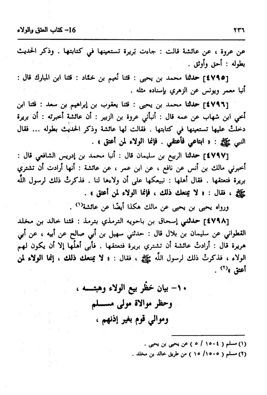 §بَيَانُ حَظْرِ بَيْعِ الْوَلَاءِ وَهِبَتِهِ، وَحَظْرِ مُوَالَاةِ مَوْلَى مُسْلِمٍ وَمَوَالِي قَوْمٍ بِغَيْرِ إِذْنِهِمْ -[237]- وَالتَّشْدِيدِ فِيهِ