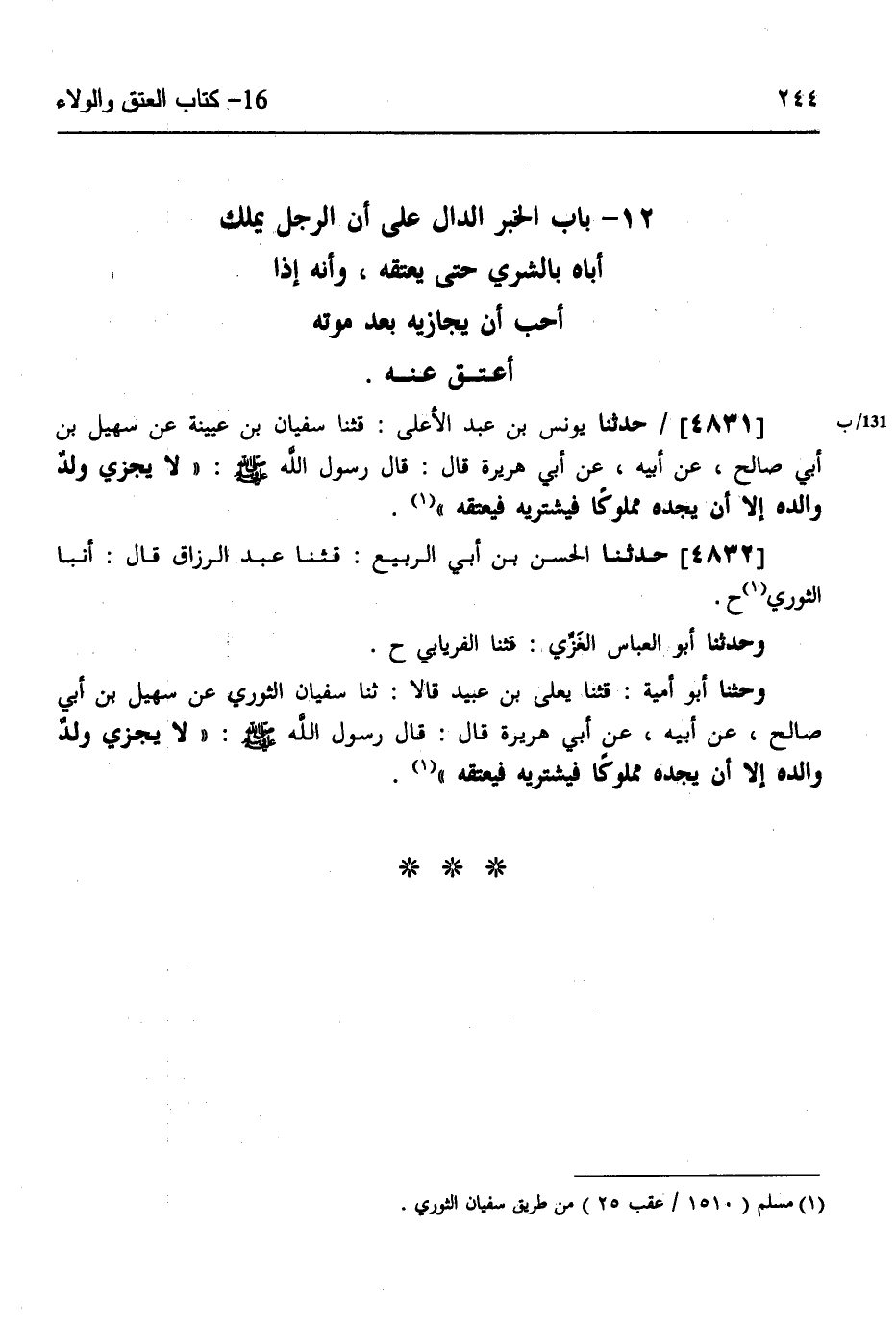 4832 - حَدَّثَنَا الْحَسَنُ بْنُ أَبِي الرَّبِيعِ، قثنا عَبْدُ الرَّزَّاقِ، قَالَ: أنبا الثَّوْرِيُّ، ح وَحَدَّثَنَا أَبُو الْعَبَّاسِ الْغَزِّيُّ، قثنا الْفِرْيَابِيُّ، ح وَحثنا أَبُو أُمَيَّةَ، قثنا يَعْلَى بْنُ عُبَيْدٍ، قَالَا: ثَنَا سُفْيَانُ الثَّوْرِيُّ، عَنْ سُهَيْلِ بْنِ أَبِي صَالِحٍ، عَنْ أَبِيهِ، عَنْ أَبِي هُرَيْرَةَ، قَالَ: قَالَ رَسُولُ اللَّهِ صَلَّى اللهُ عَلَيْهِ وَسَلَّمَ: «§لَا يَجْزِي وَلَدٌ وَالِدَهُ إِلَّا أَنْ يَجِدُهُ مَمْلُوكًا، فَيَشْتَرِيَهُ، فَيُعْتِقَهُ»
